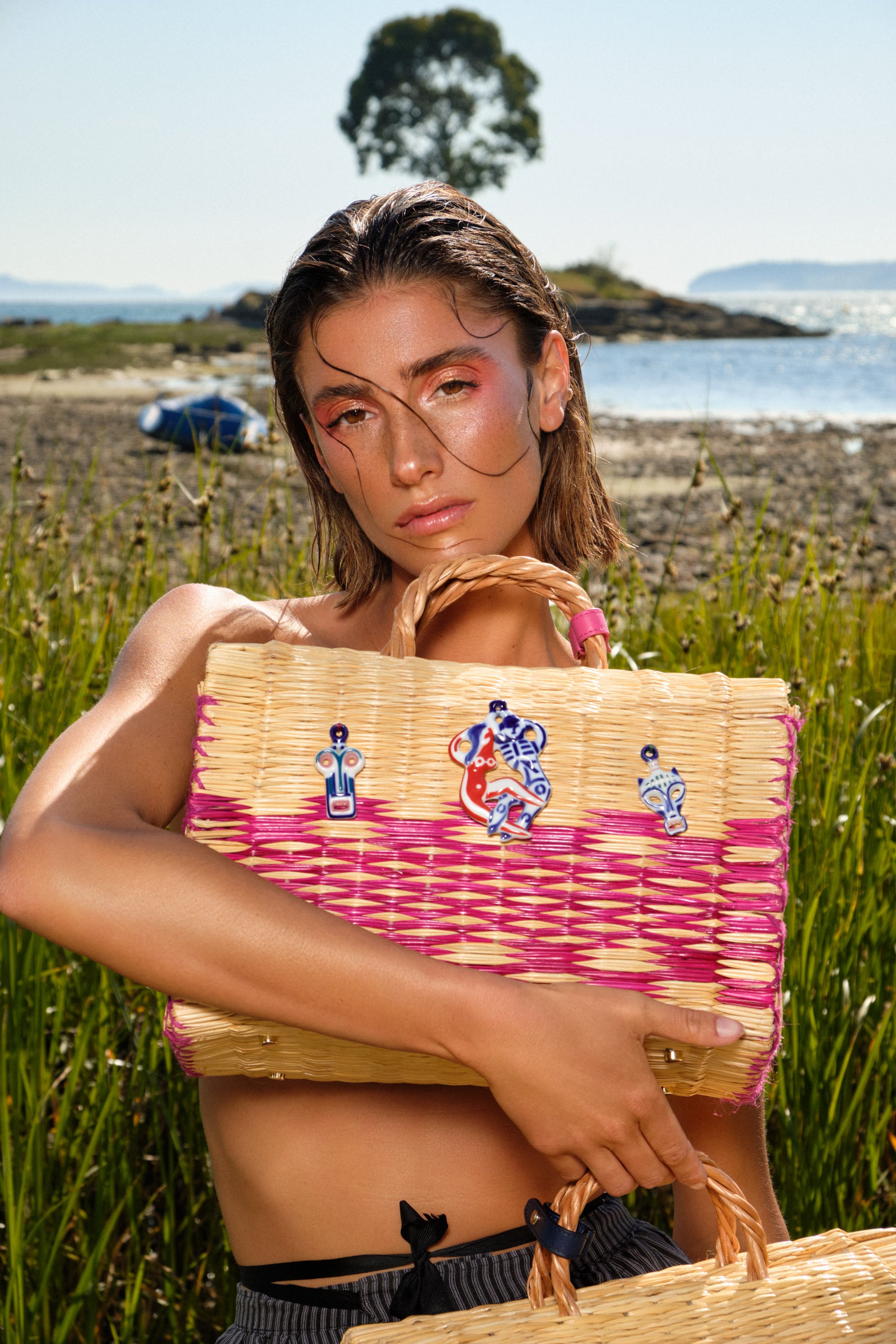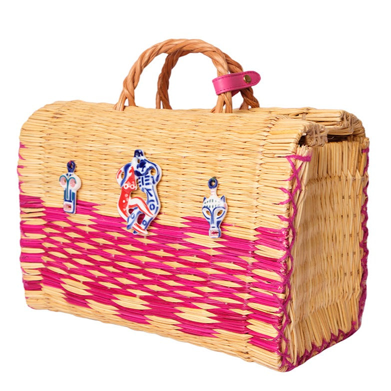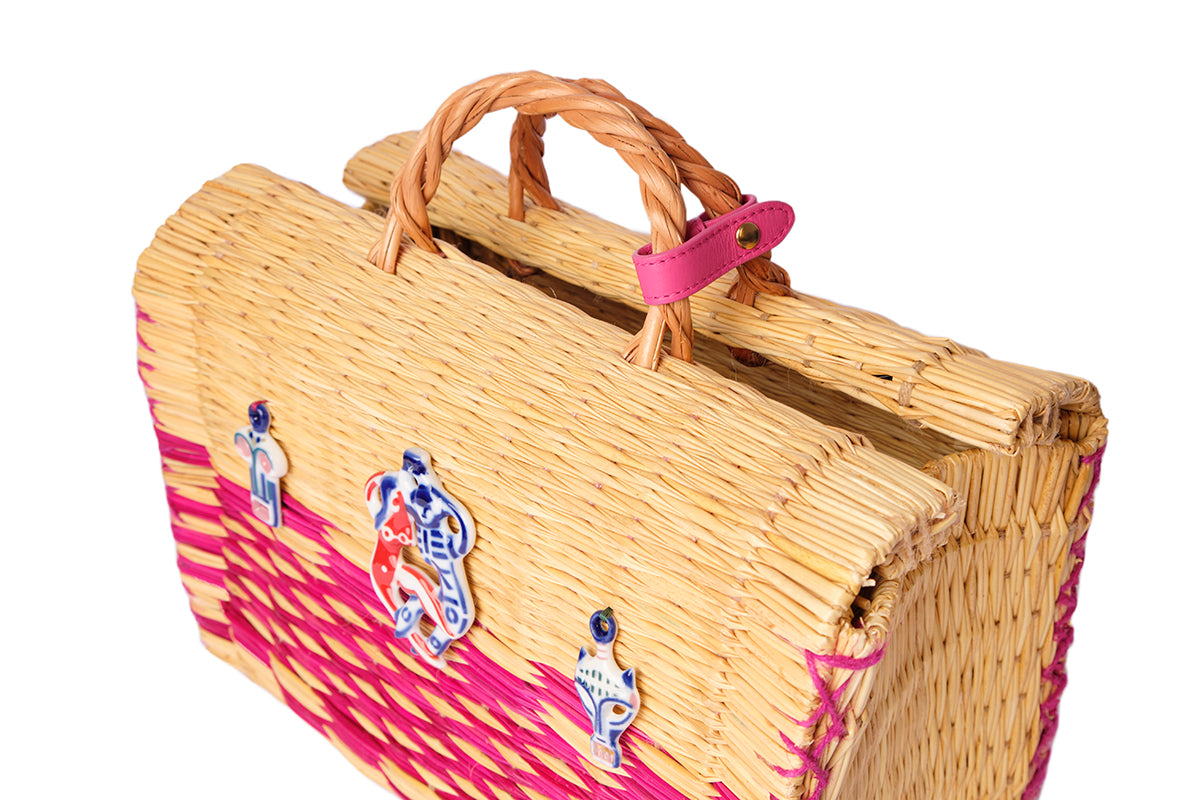 At its heart lies our lucky charm talisman handbag, a collage of the traditional Portuguese handwoven reed basket with the porcelain Biser charm from Sargadelos.The biser charm helps those who seek love.