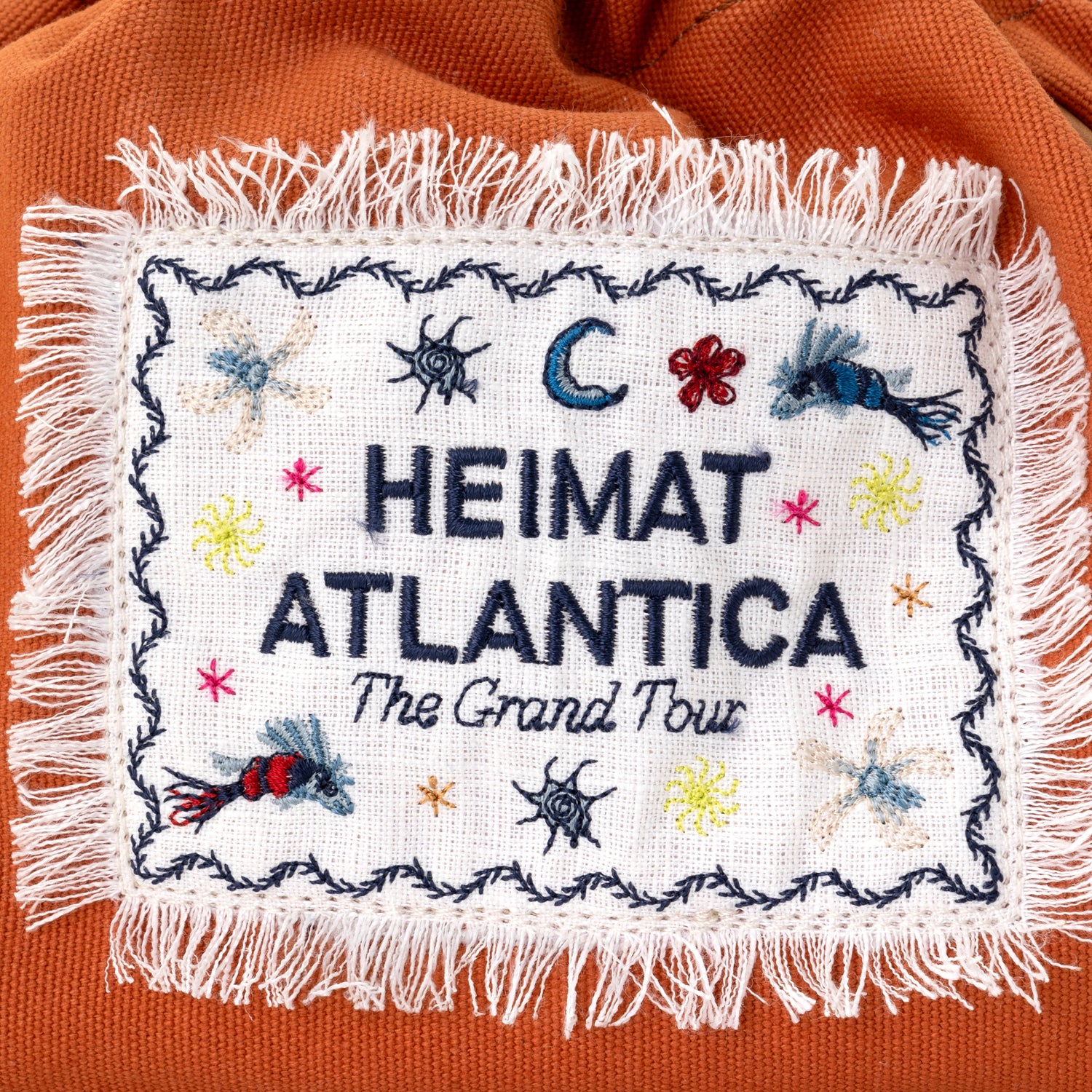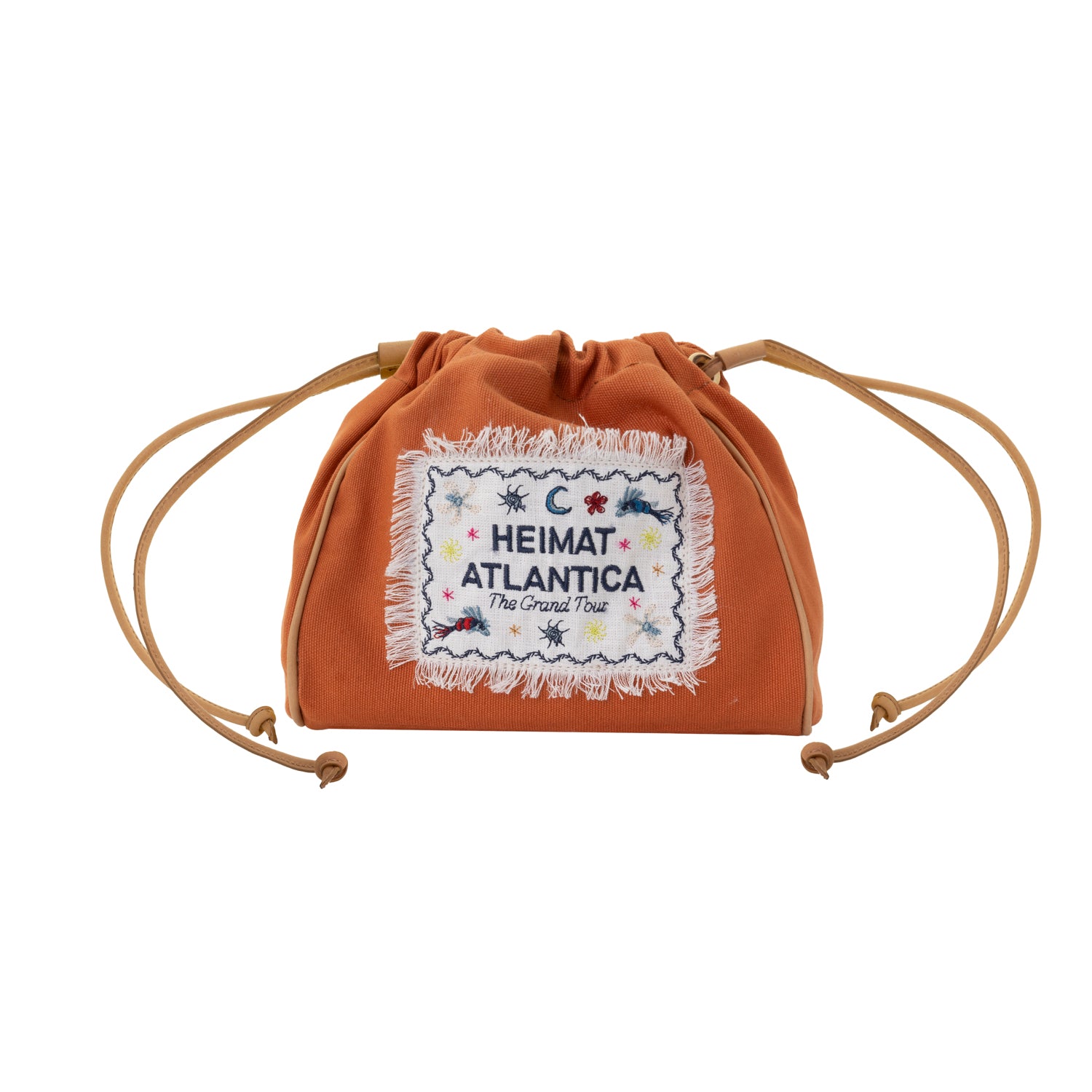 Heimat Atlantica’s pouches are crafted in Spain from cotton and leather with a striped exterior design and an embroidered label—a small canvas that encapsulates the spirit of the collection, inspired by the Galician magical realism and represented by a mythical fish, a celestial traveler that glides effortlessly between the deep Atlantic waters and the vast starry sky, carrying with it the stories of distant lands where flowers bloom in unknown archipelagos, and the sea whispers forgotten tales.