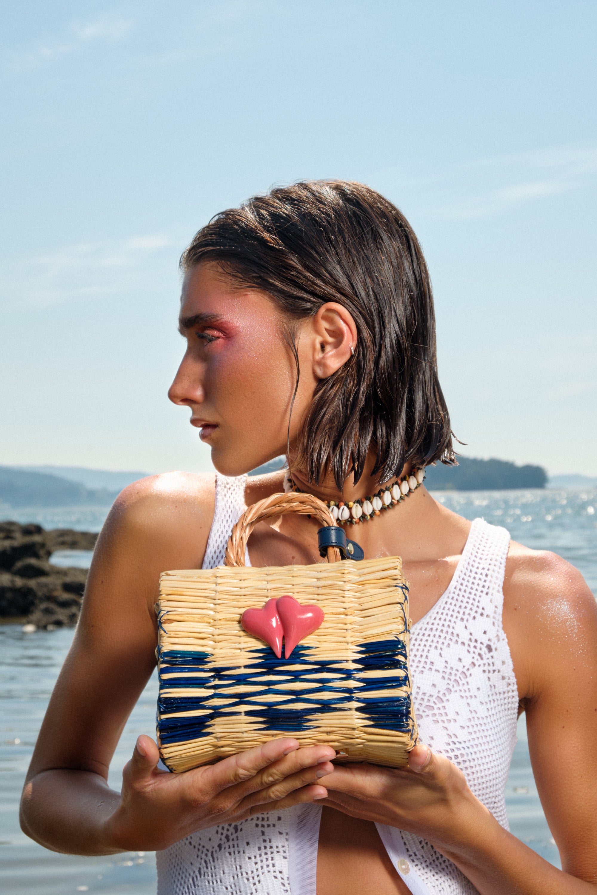 하이맷 아틀란티카의 바스켓 백은 장인의 손길이 담긴 아이템으로 혁신과 전통 공예 기법의 조화가 만들어내는 아름다움을 잘 보여줍니다. 가방의 가운데에 위치한 럭키 참 장식에 주목해 보세요. 포르투갈에서 갈대를 수작업으로 엮어 제작된 리드 바스켓에 사랑스러운 하트 모양의 전통적인 도자기 참을 달아 완성했습니다.