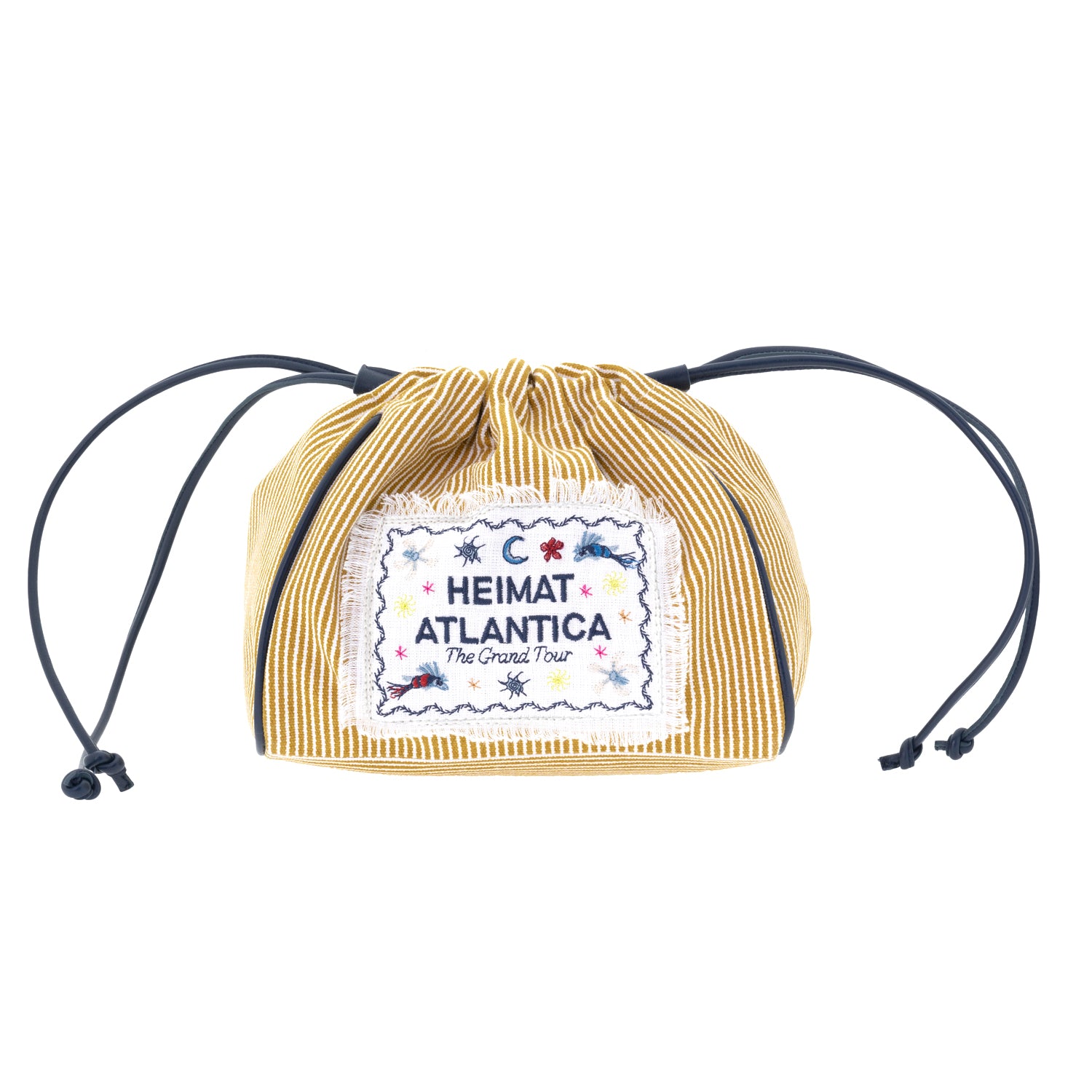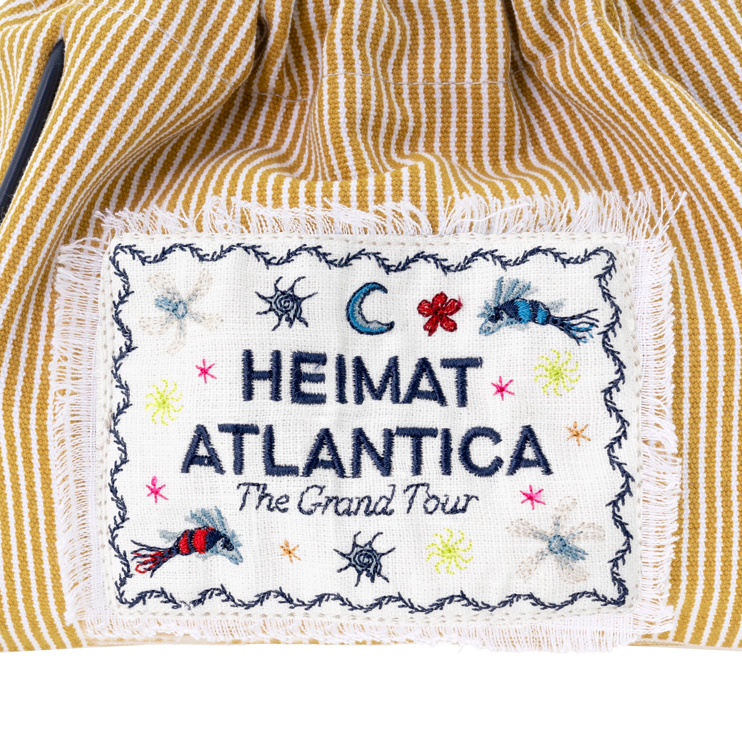 Heimat Atlantica 's pouches are crafted in Spain from cotton and leather with a striped exterior design and an embroidered label—a small canvas that encapsulates the spirit of the collection, inspired by the Galician magical realism and represented by a mythical fish, a celestial traveler that glides effortlessly between the deep Atlantic waters and the vast starry sky, carrying with it the stories of distant lands where flowers bloom in unknown archipelagos, and the sea whispers forgotten tales.