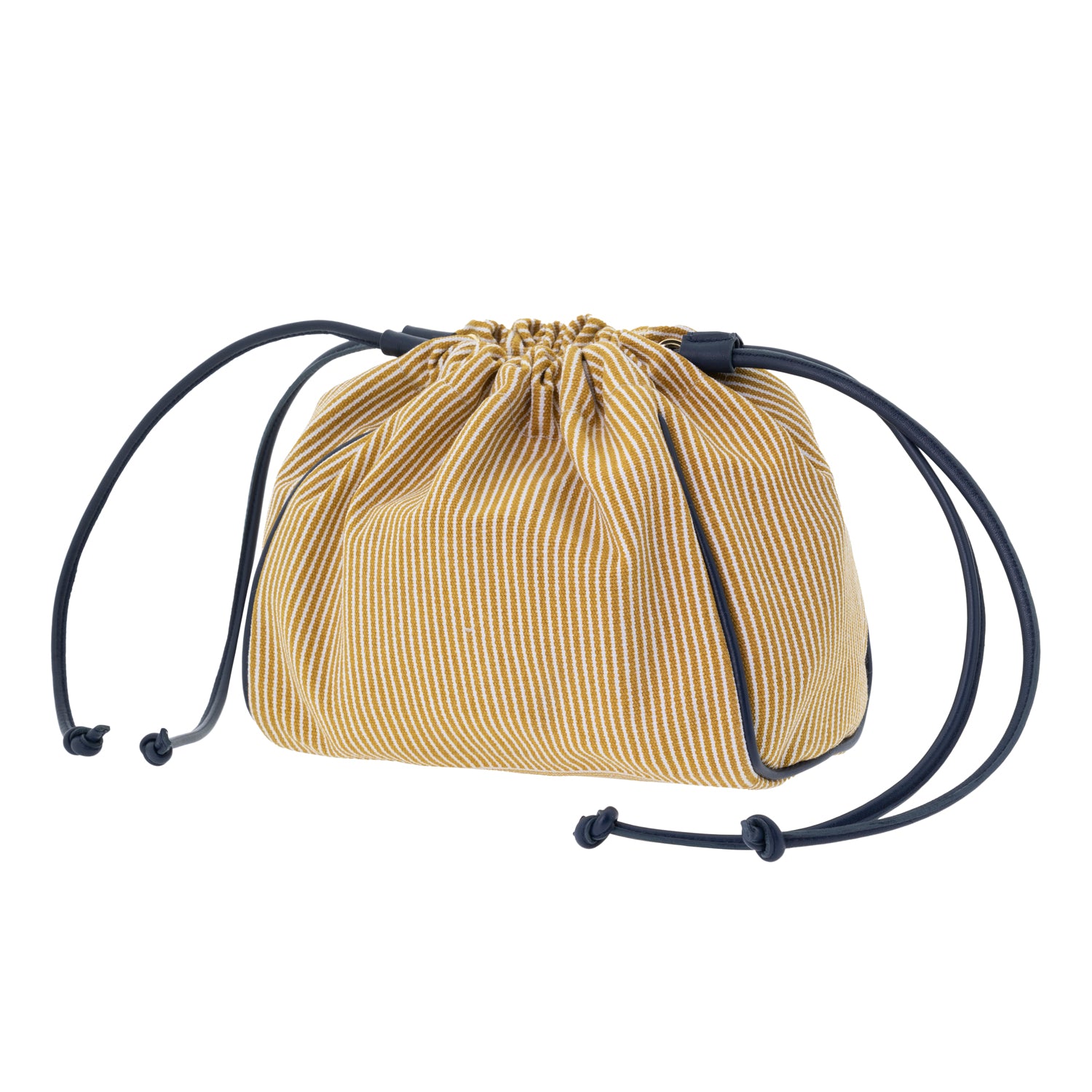 This delicately ruffled bag with leather drawstrings is ideal for holding your essentials. It has a plaid interior, a compartment for your frequently used cards, and space for your phone, sunscreen and keys. It may also be slipped into our totes or handbags.