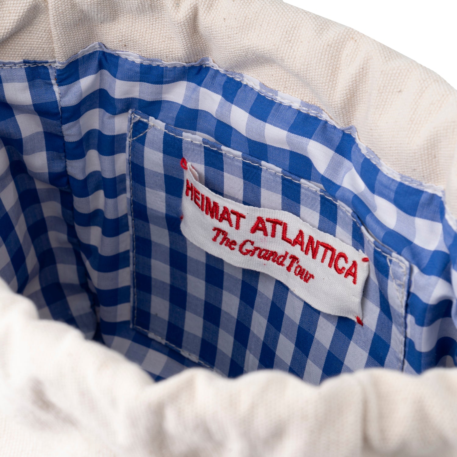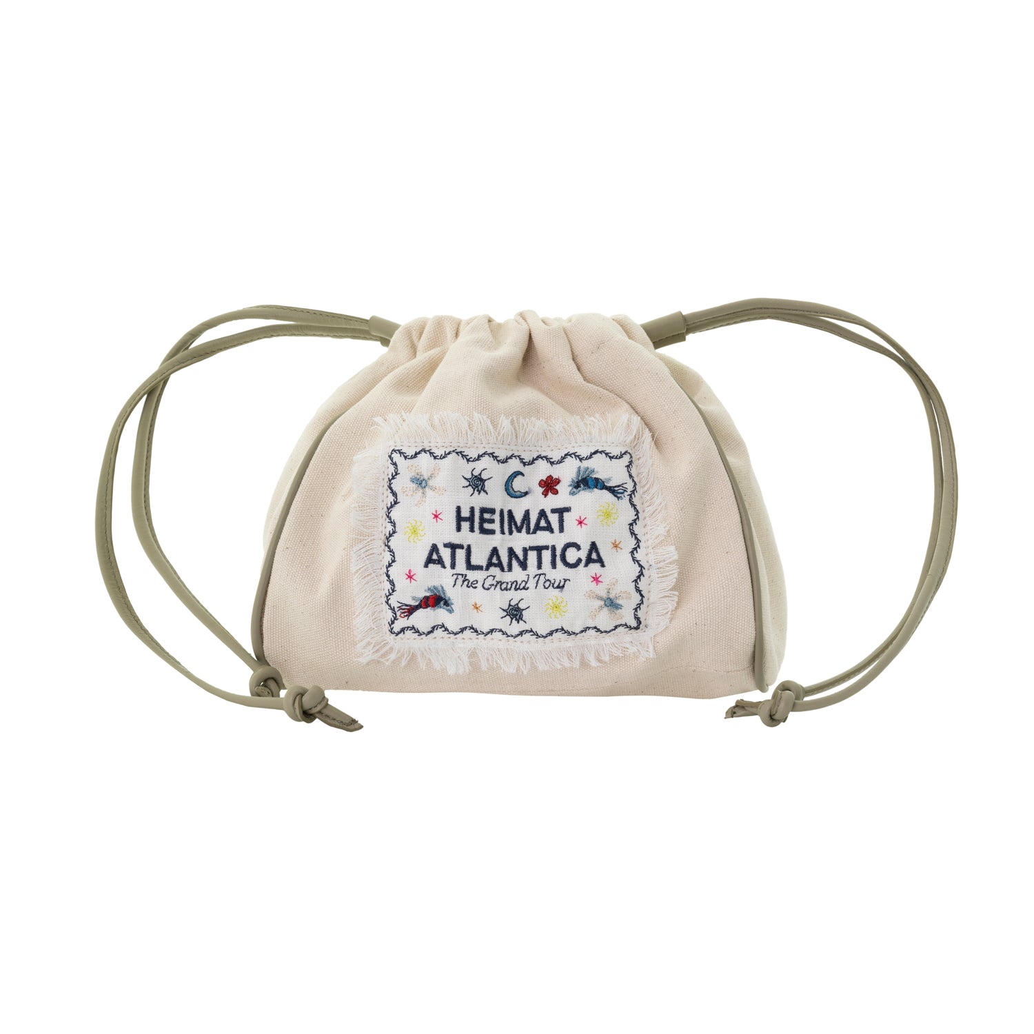 Heimat Atlantica’s pouches are crafted in Spain from cotton and leather with a striped exterior design and an embroidered label—a small canvas that encapsulates the spirit of the collection, inspired by the Galician magical realism and represented by a mythical fish, a celestial traveler that glides effortlessly between the deep Atlantic waters and the vast starry sky, carrying with it the stories of distant lands where flowers bloom in unknown archipelagos, and the sea whispers forgotten tales.