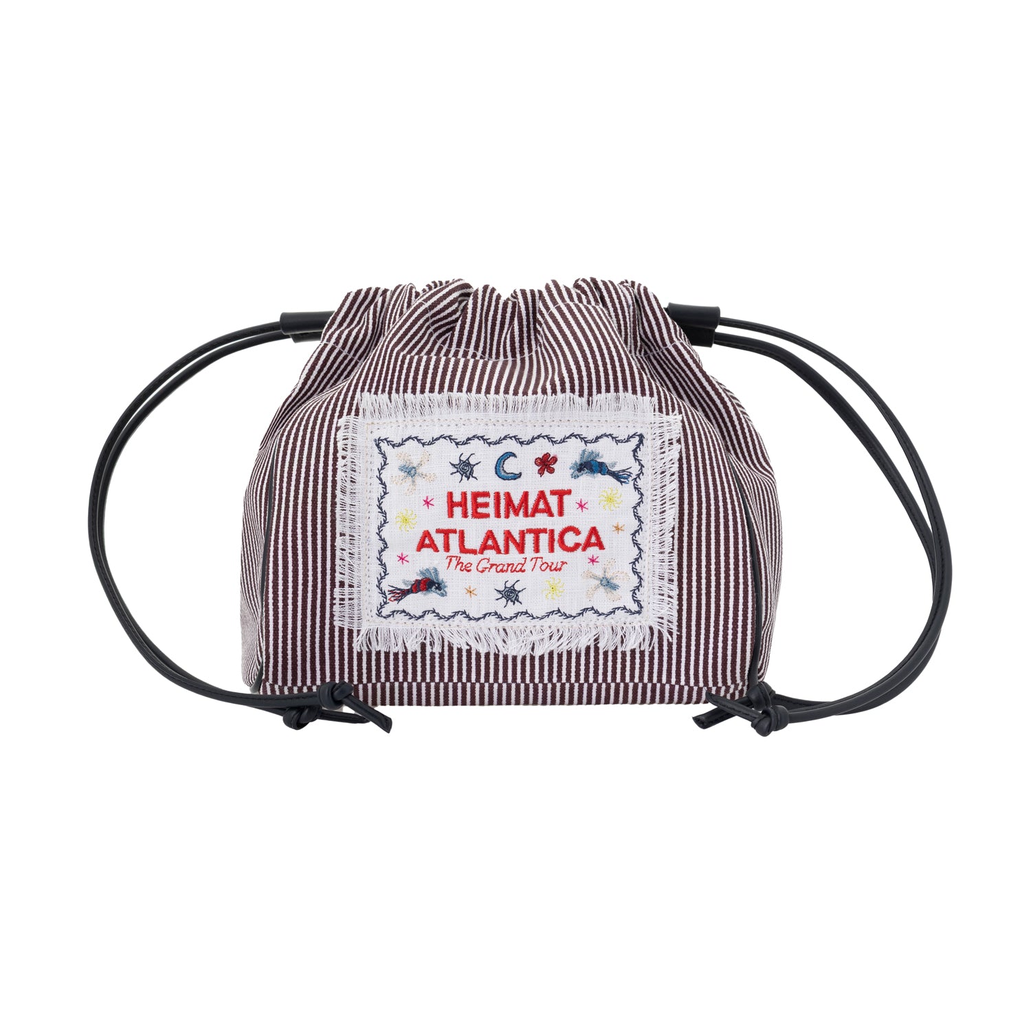 Heimat Atlantica 's pouches are crafted in Spain from cotton and leather with a striped exterior design and an embroidered label—a small canvas that encapsulates the spirit of the collection, inspired by the Galician magical realism and represented by a mythical fish, a celestial traveler that glides effortlessly between the deep Atlantic waters and the vast starry sky, carrying with it the stories of distant lands where flowers bloom in unknown archipelagos, and the sea whispers forgotten tales.