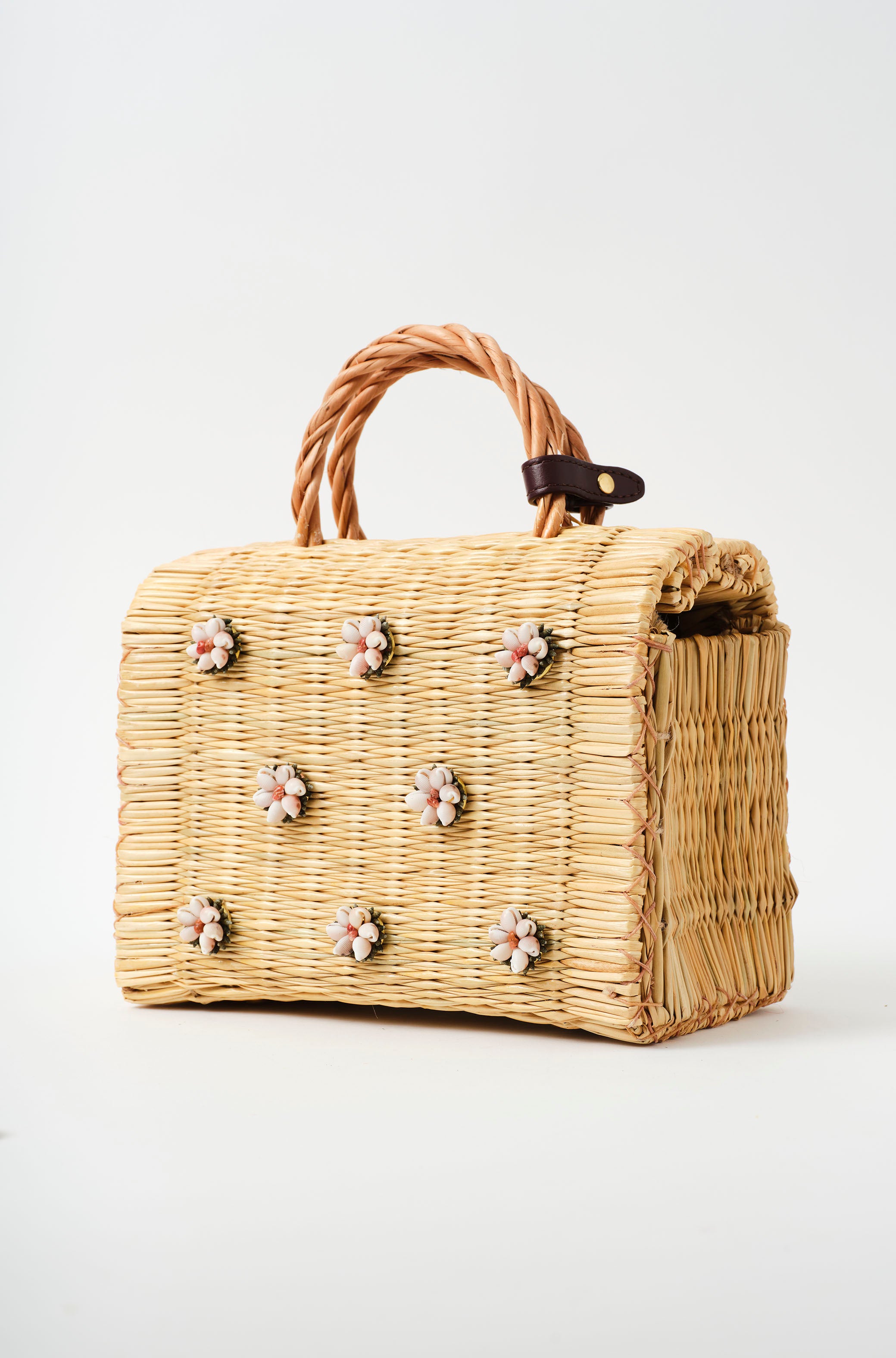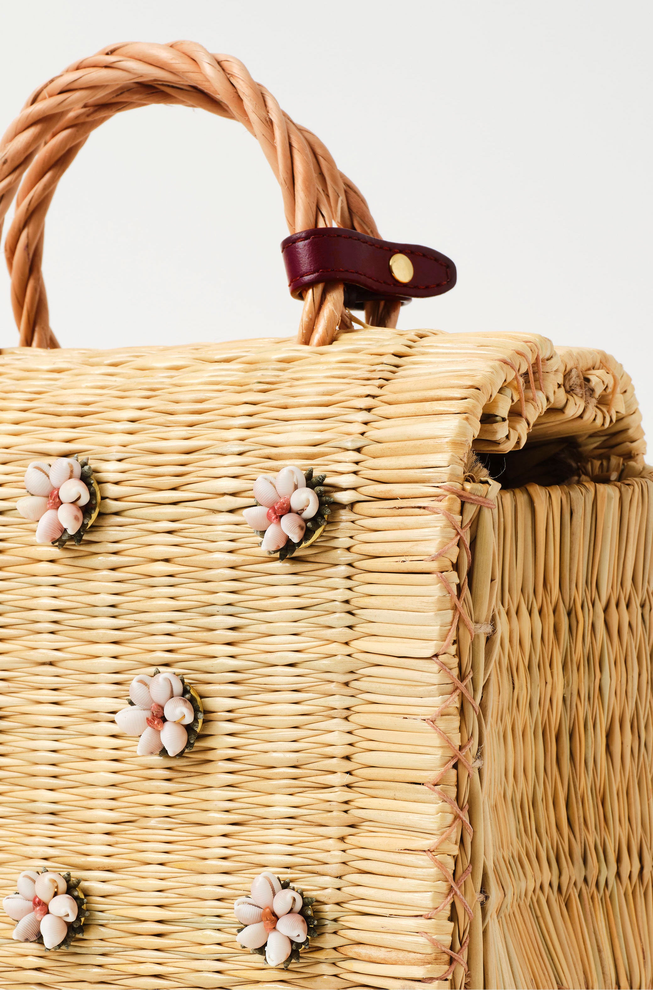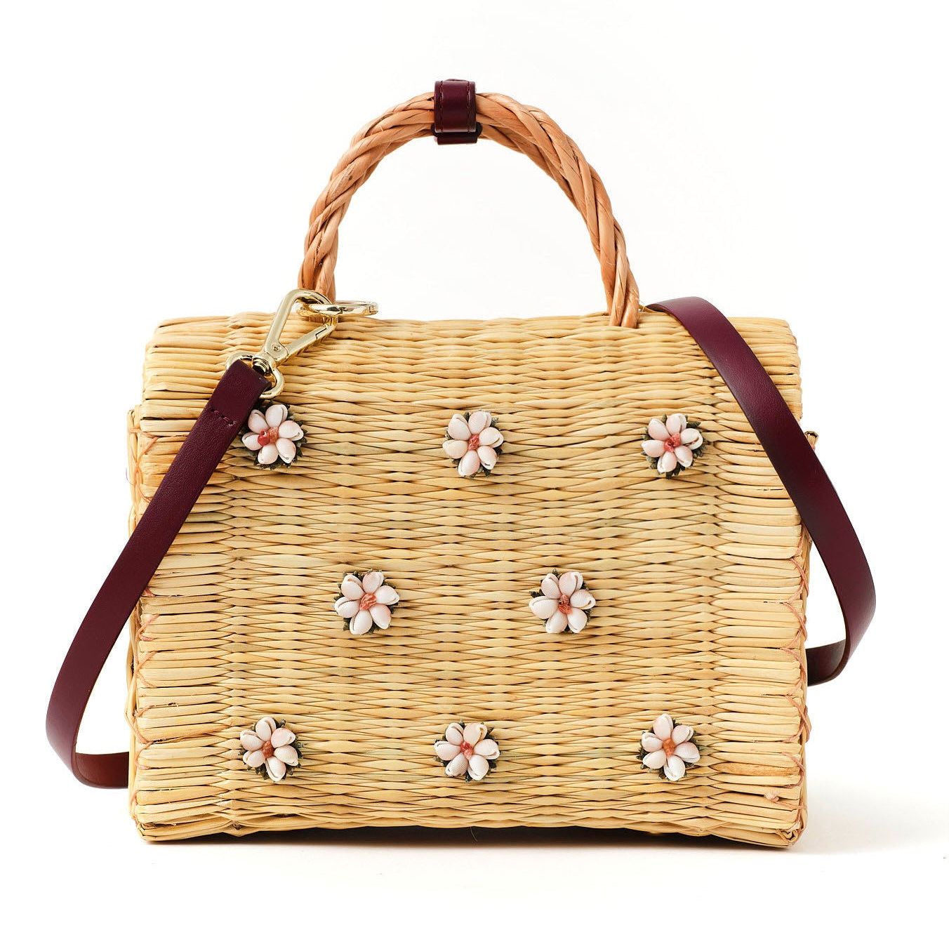 The Shella Medium Burgundy basket bag is a delicate tapestry of tradition and enchantment. Handwoven from Portuguese traditional reed technique by our artisans, it features delicate hand-embroidered shell flowers that bring the enchanting allure of the sea to your wardrobe.