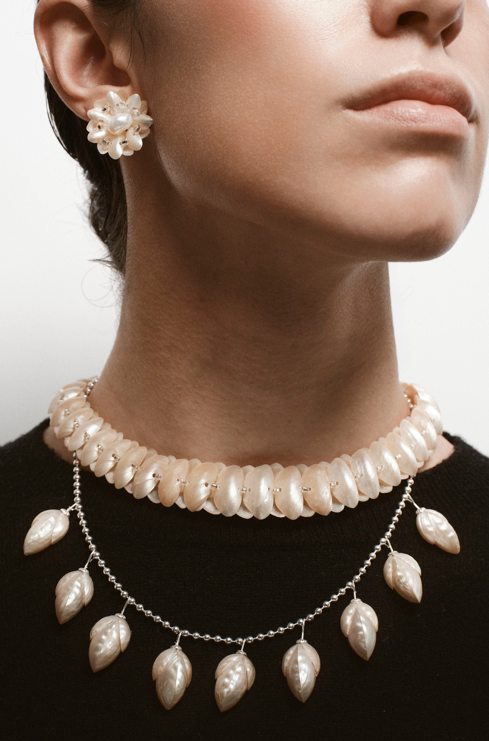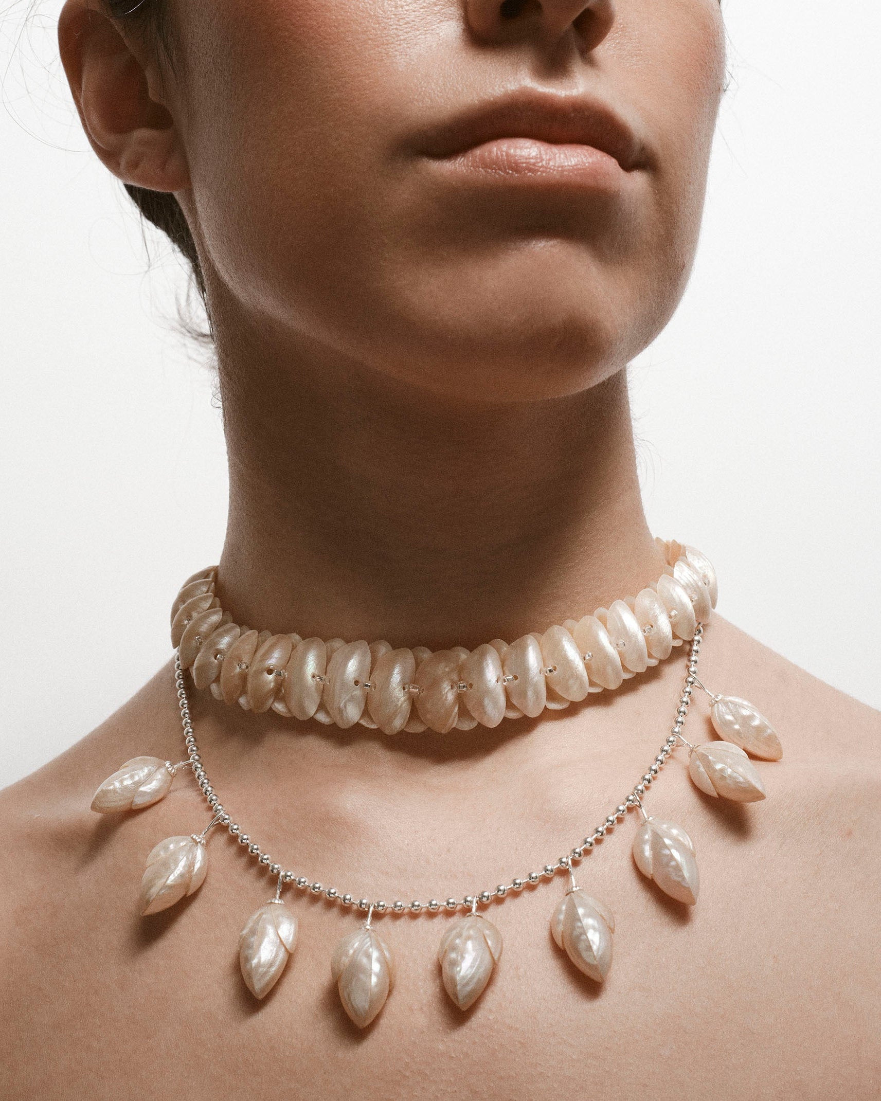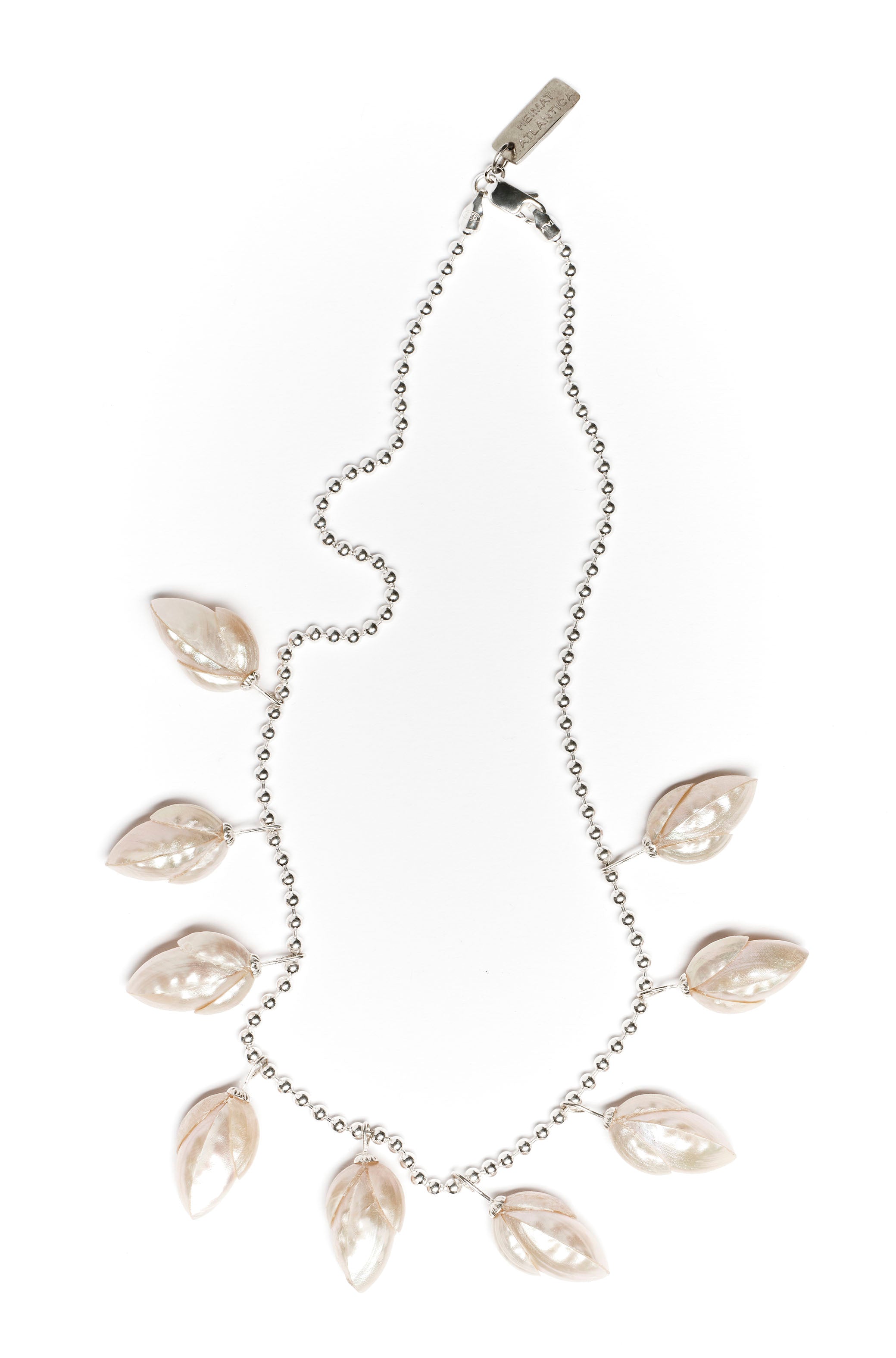 The Atlantic Leaves Necklace features hand-carved mother-of-pearl charms shaped like ocean leaves. Suspended from a silver bead chain, they move freely with the light echoing the rhythm of waves and wind.