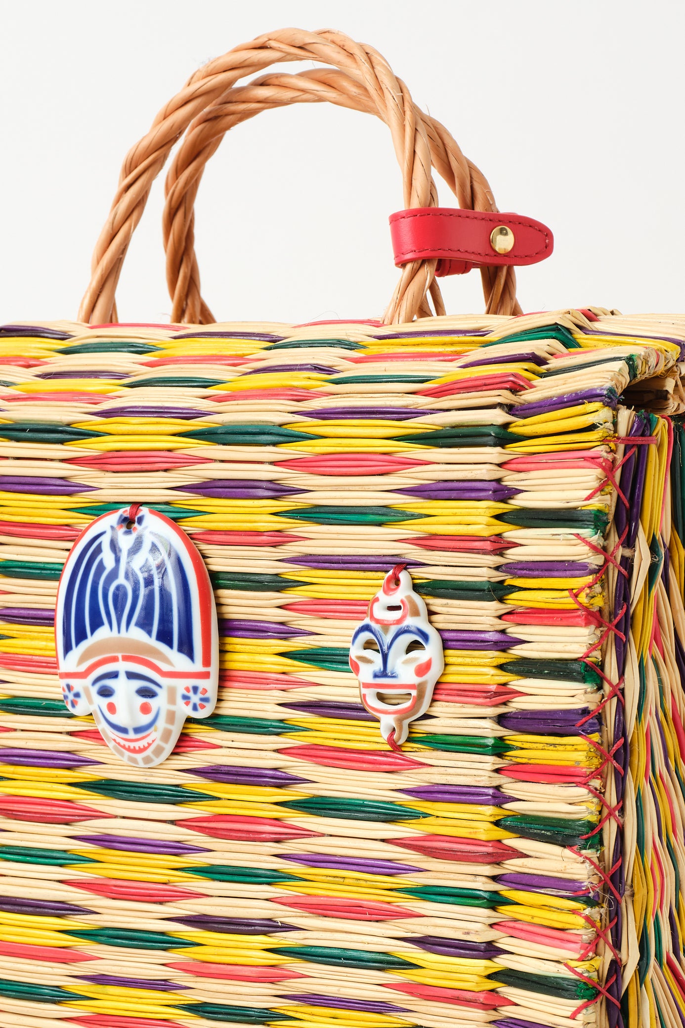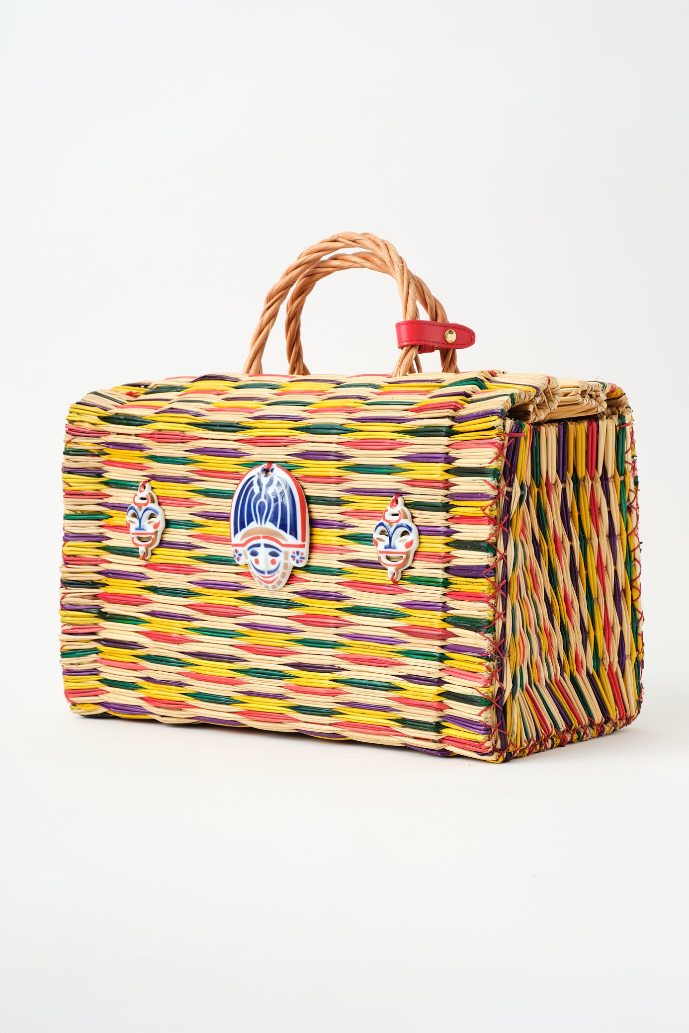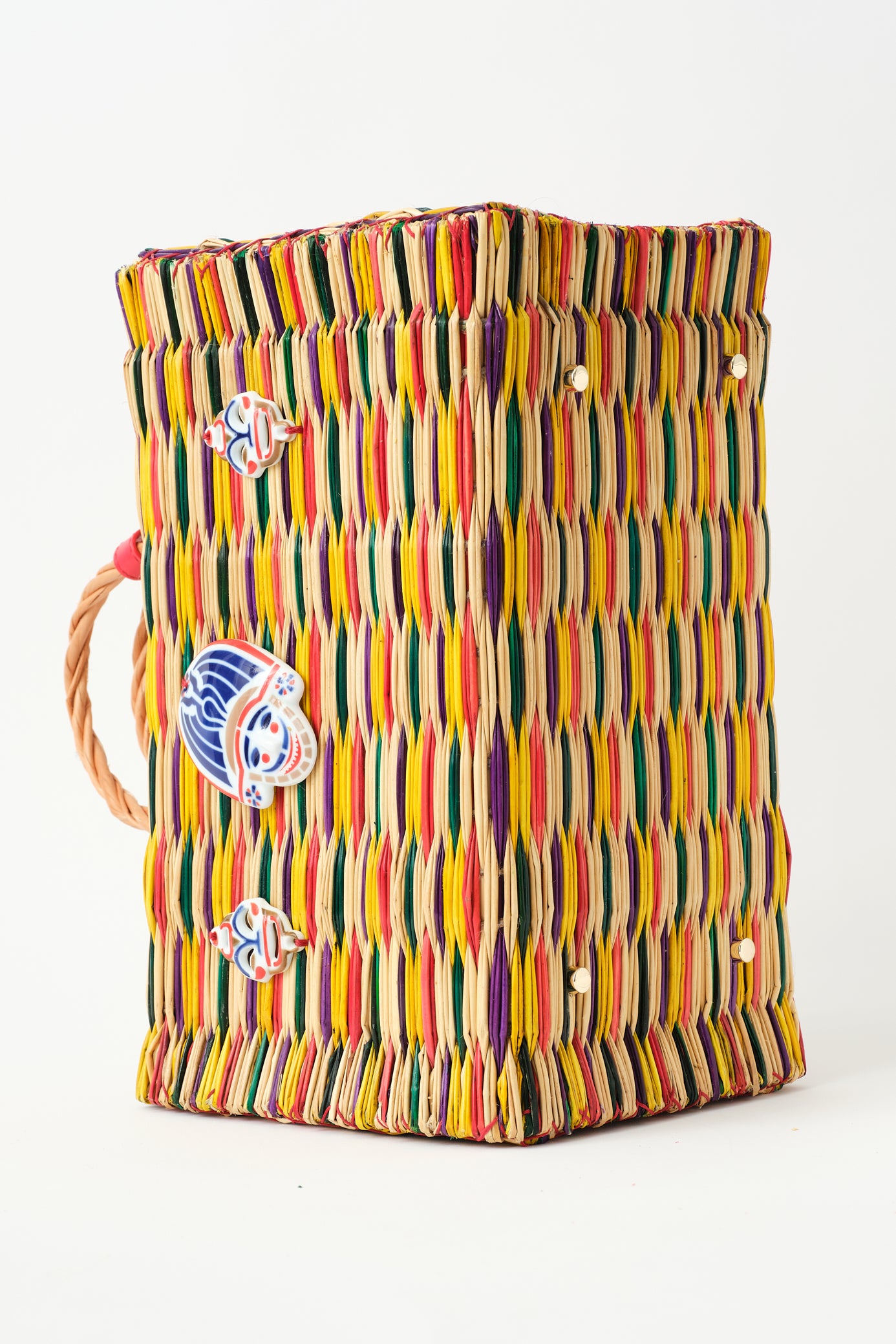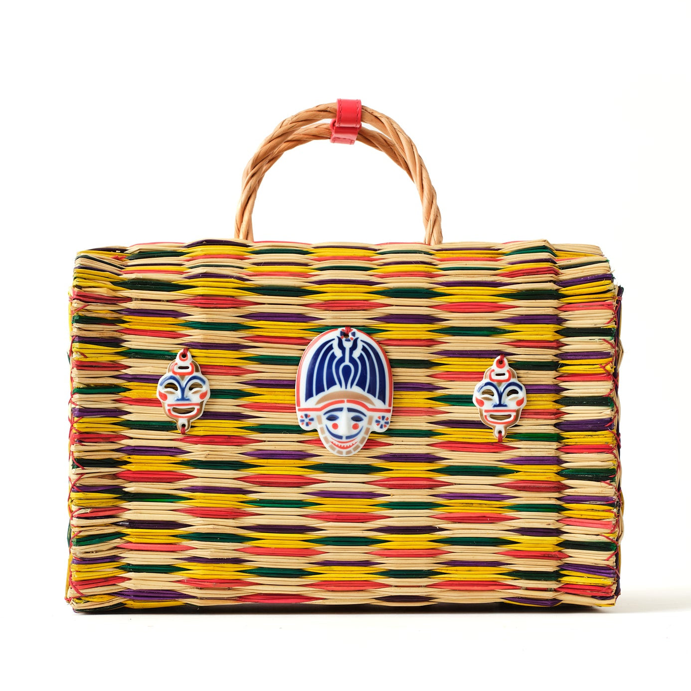 At its heart lies our lucky charm talisman handbag, a collage of the traditional Portuguese handwoven reed basket with the porcelain Cigarron charm from Sargadelos, a lucky symbol of the Galician carnival.