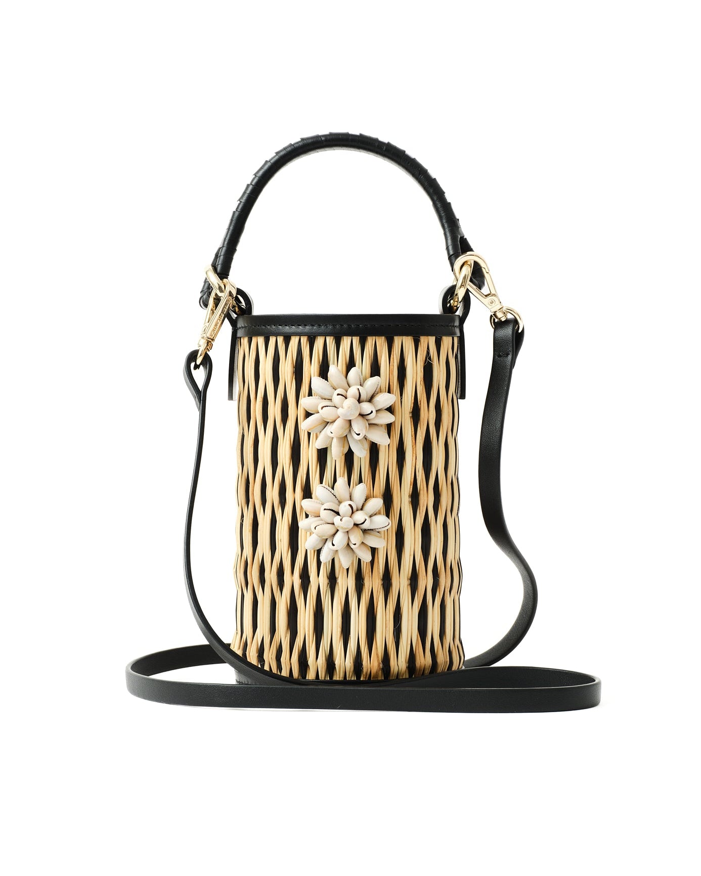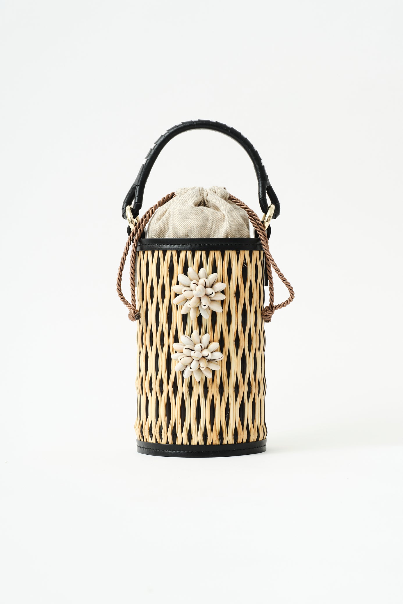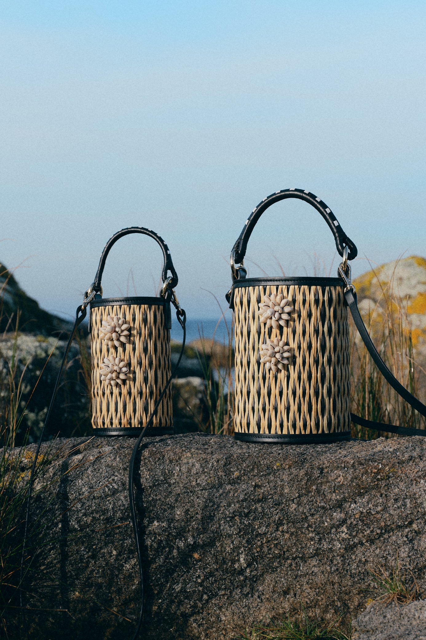 This hybrid design unites two Atlantic traditions: the Portuguese handwoven reed technique, reimagined into a cylindrical silhouette, and the Spanish leather craft of Ubrique, seamlessly assembled by skilled artisans. Each piece is embellished with hand-embroidered sea shell flowers by the Colareiras of Galicia, adding a unique cultural dialogue between Portugal and Spain.