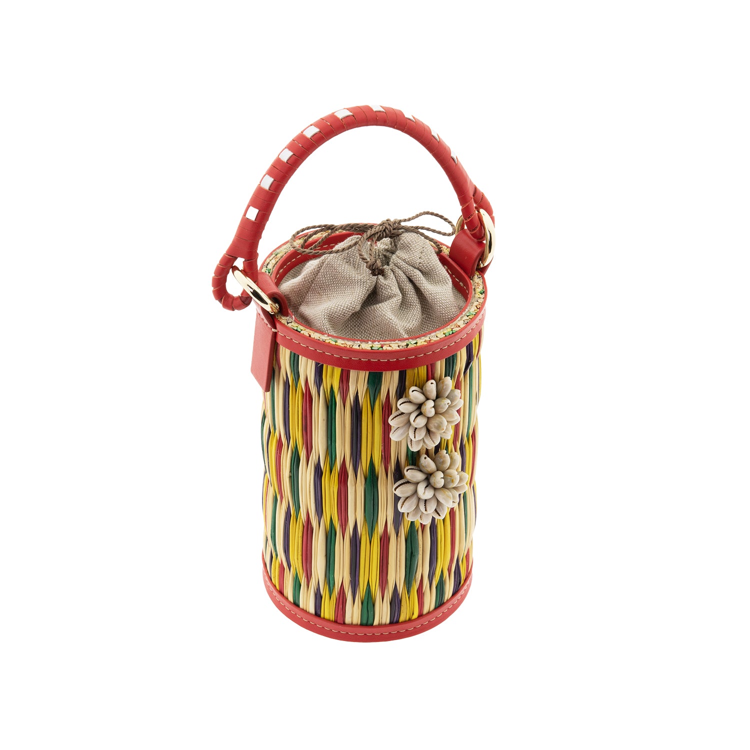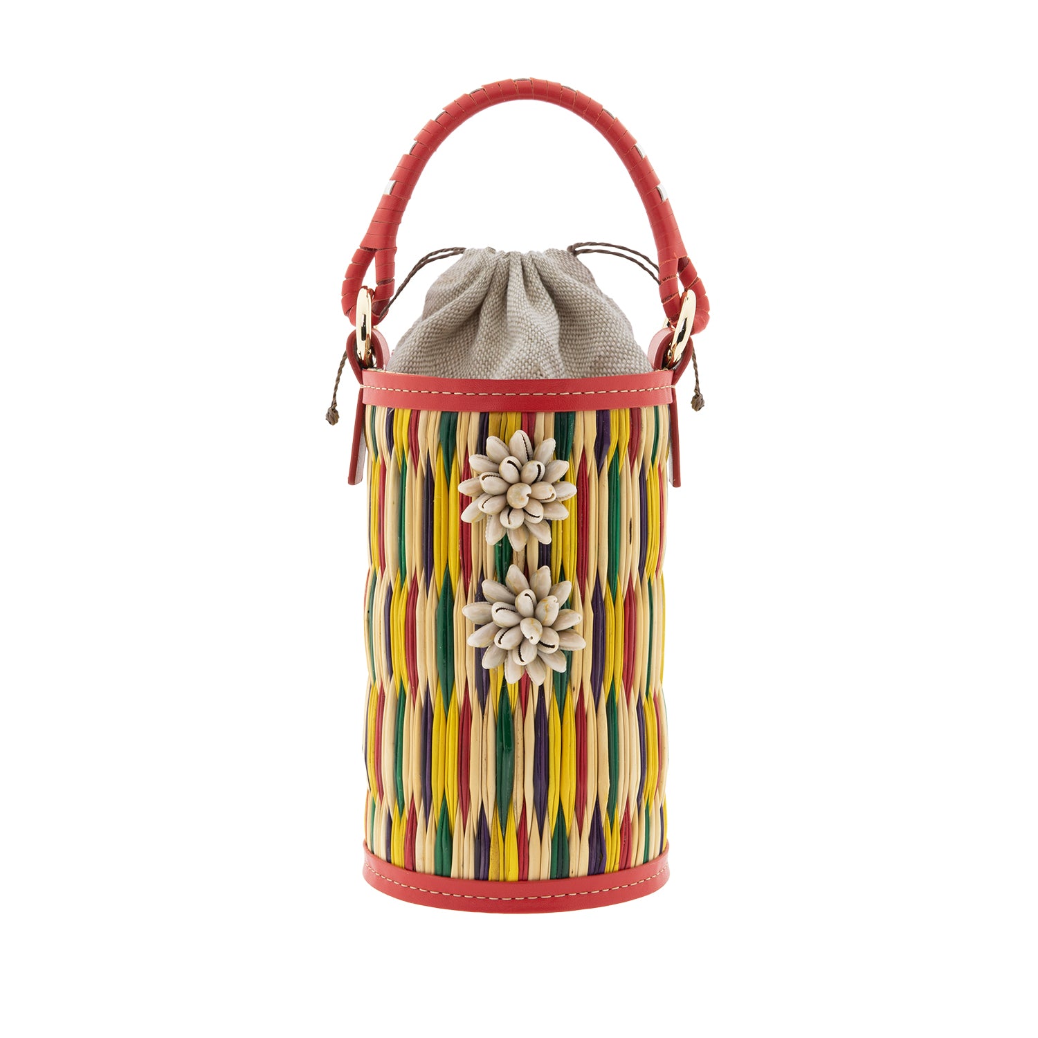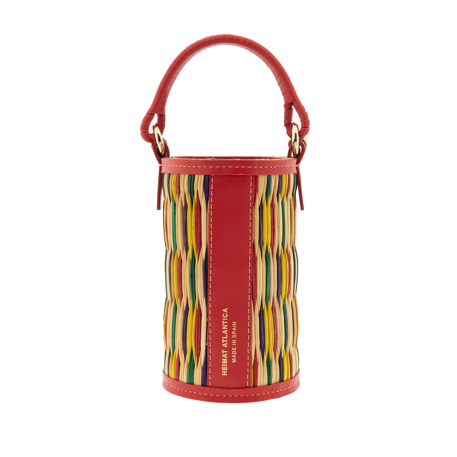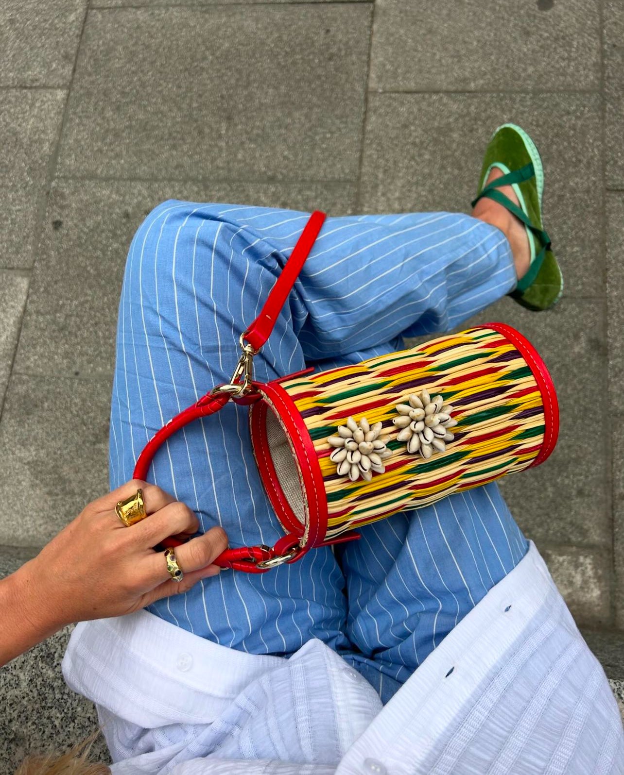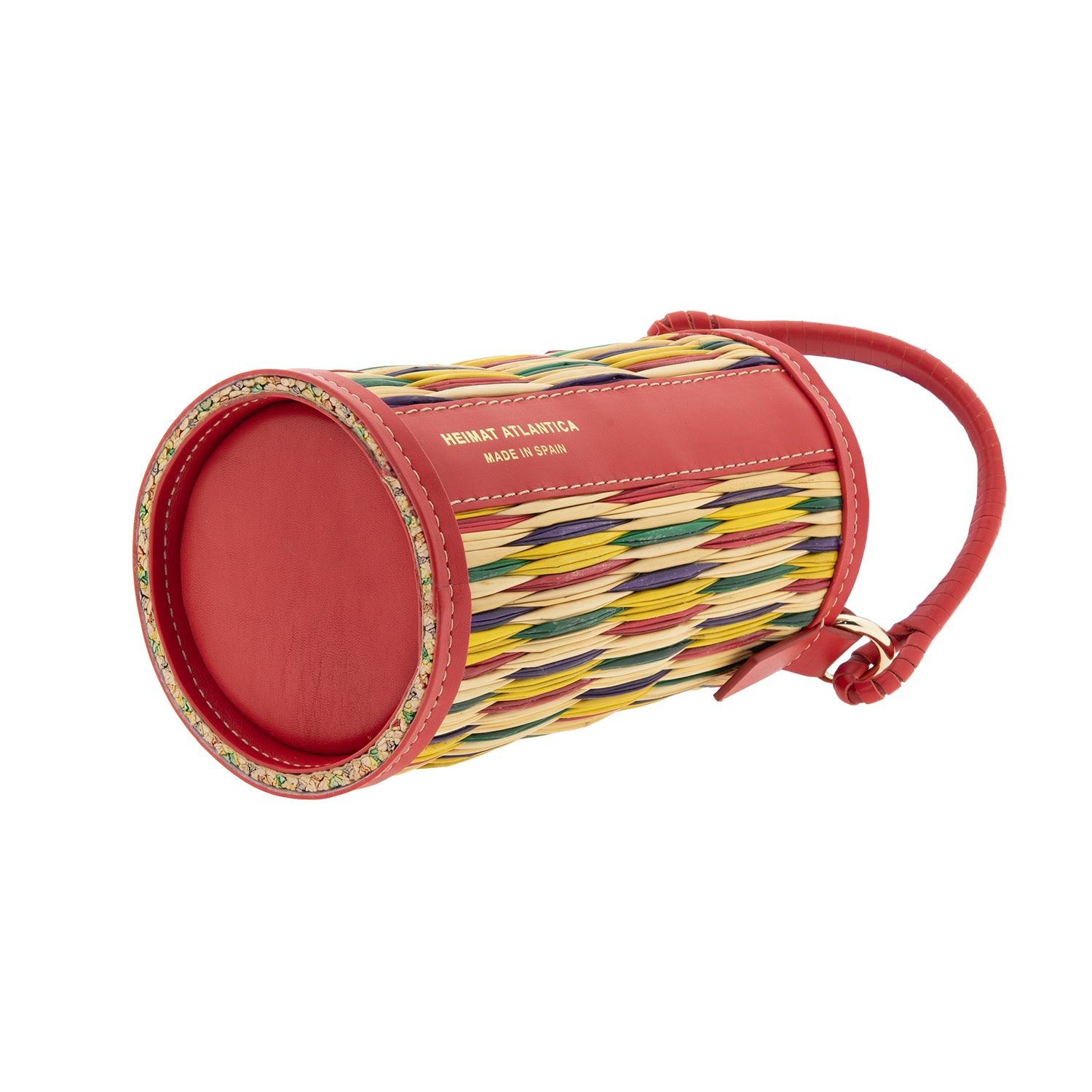 This hybrid design unites two Atlantic traditions: the Portuguese handwoven reed technique, reimagined into a cylindrical silhouette, and the Spanish leather craft of Ubrique, seamlessly assembled by skilled artisans. Each piece is embellished with hand-embroidered sea shell flowers by the Colareiras of Galicia, adding a unique cultural dialogue between Portugal and Spain.