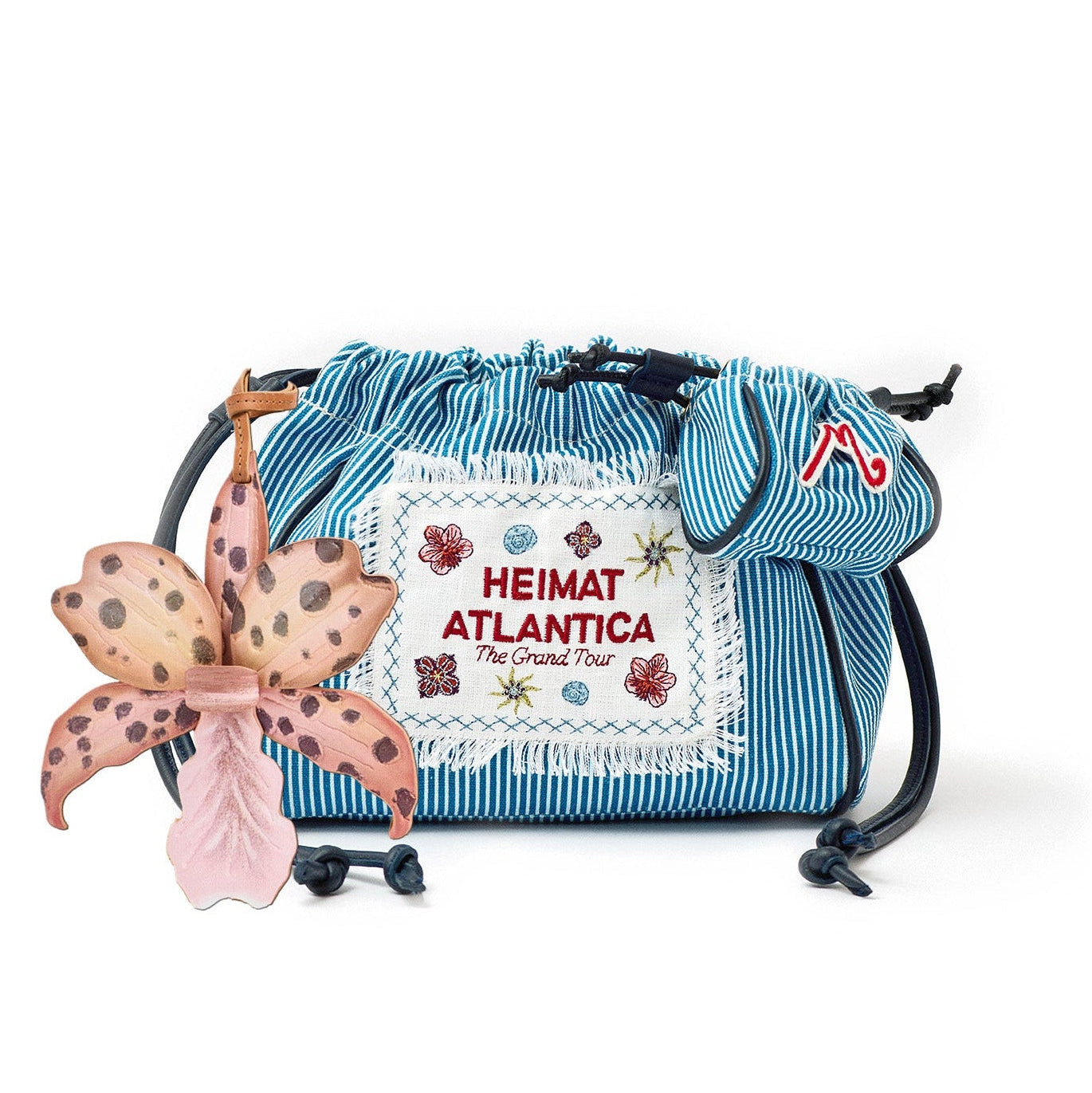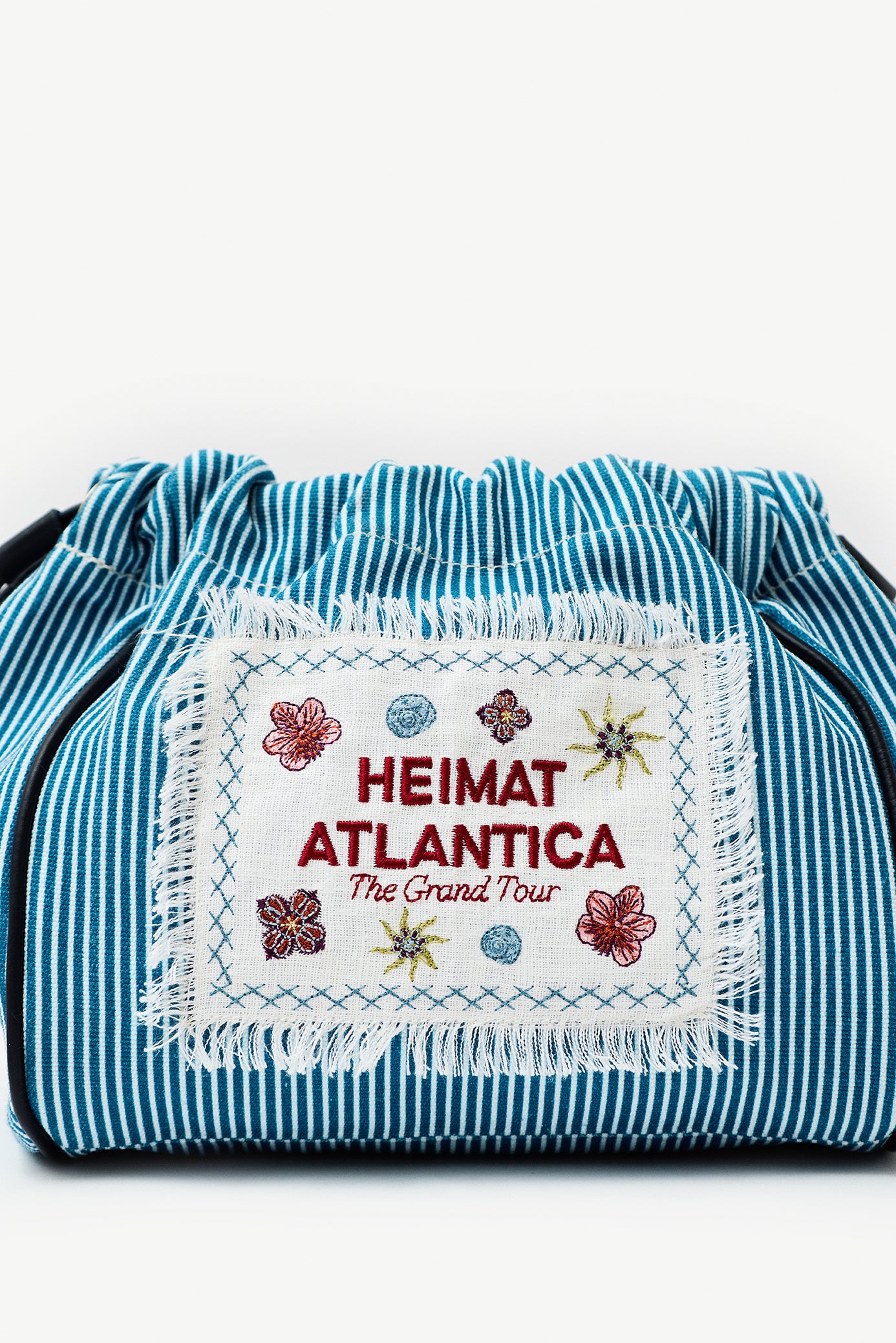 The pouch offers a soft, familiar structure—lightweight and effortless, made to carry your essentials from morning to evening. Its striped cotton exterior evokes the rhythm of the Atlantic, while the embroidered label introduces a quieter, more organic expression.