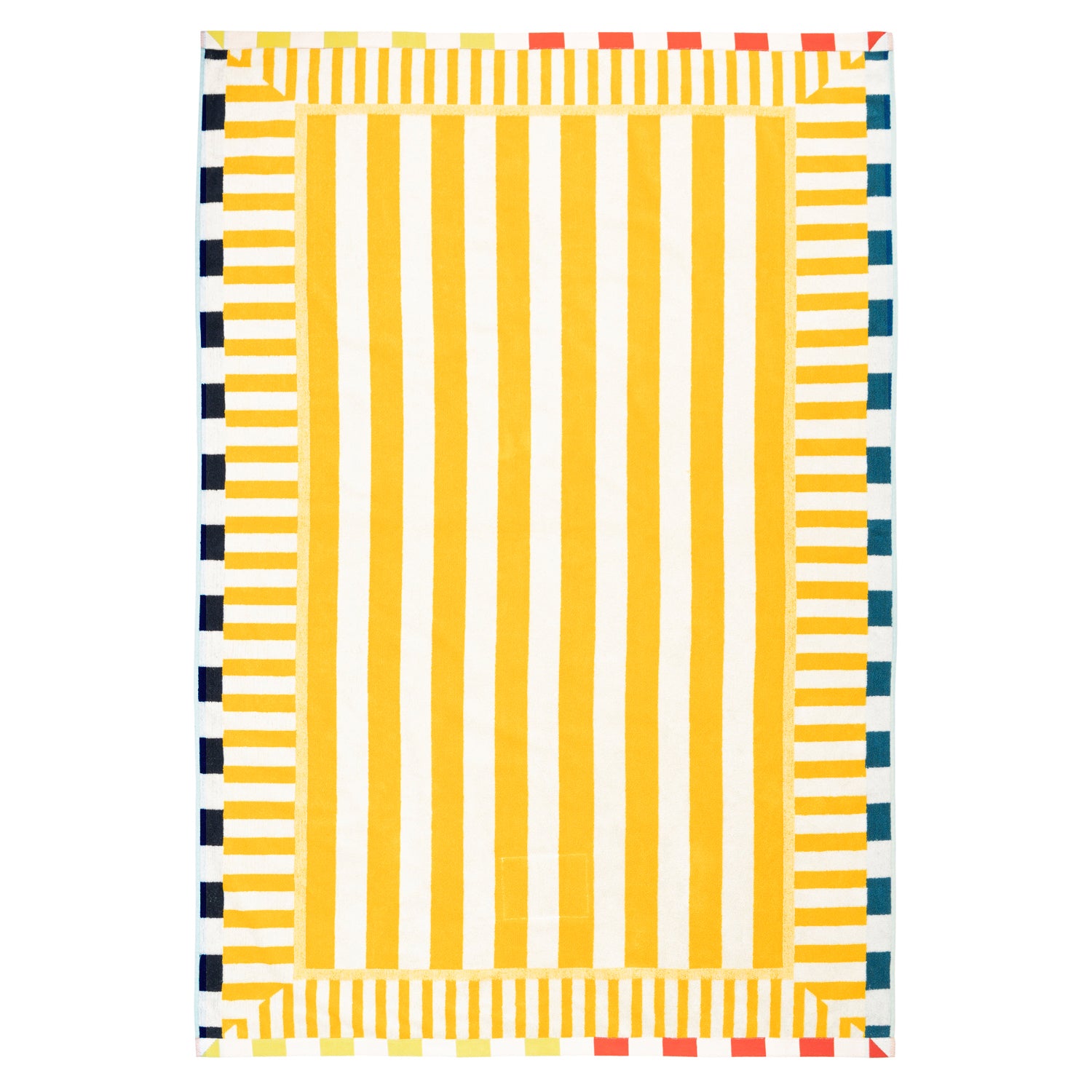 This towel will join you on your beach days in comfort and style. Its distinctive design and colorfully striped borders make it easy to spot.