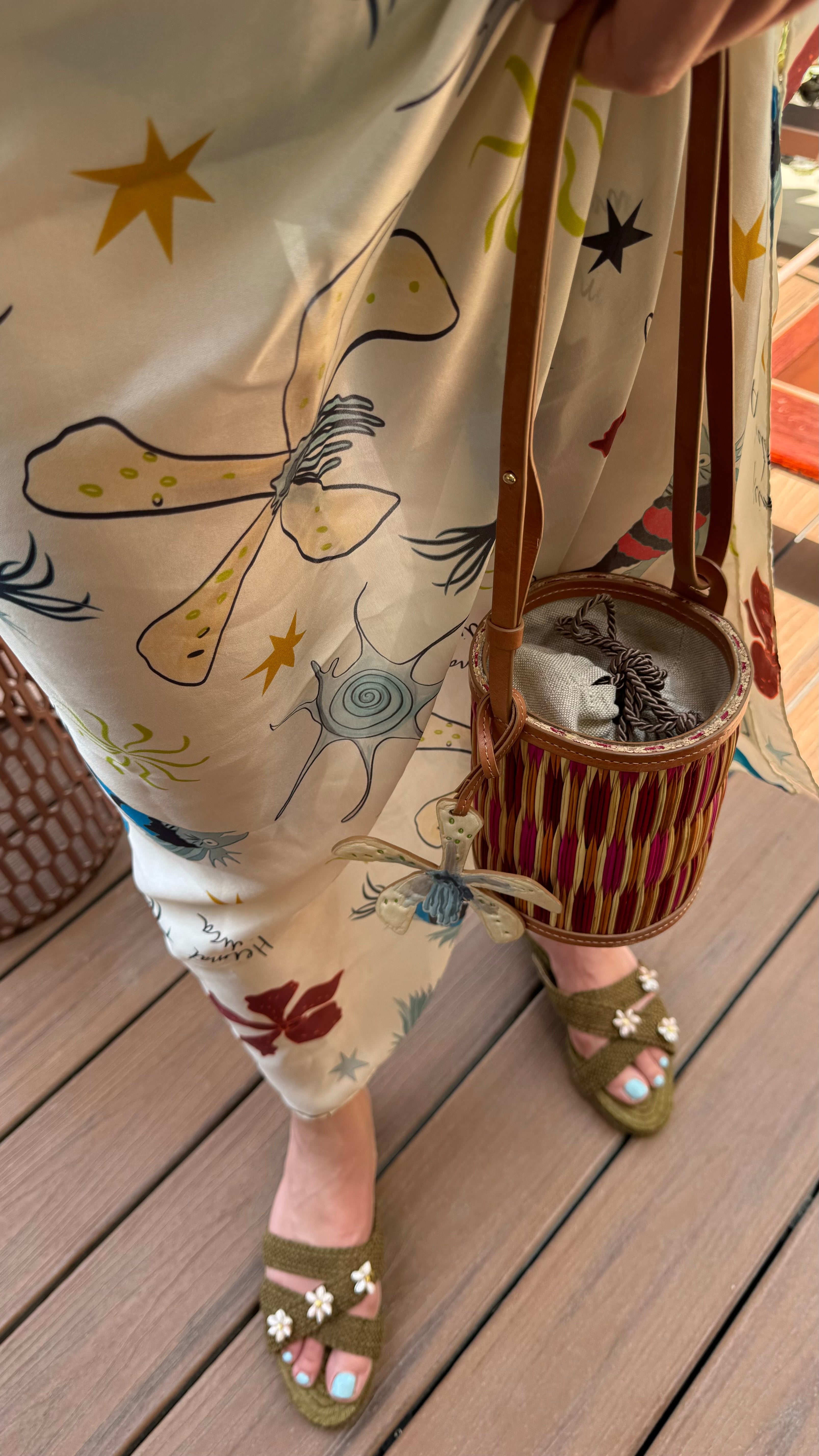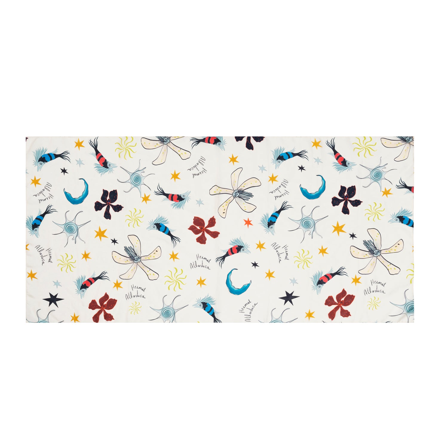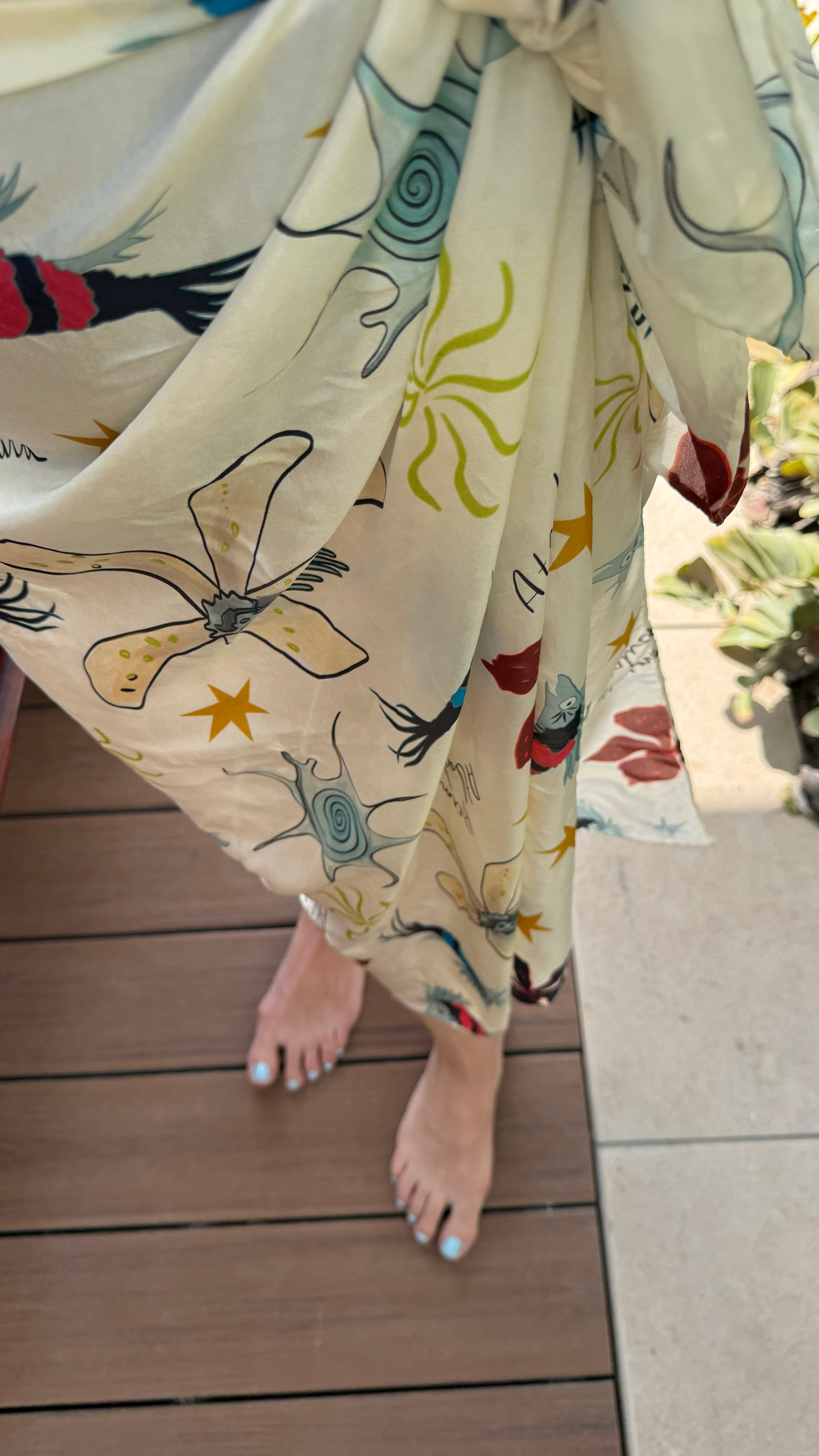 A lightweight piece that evokes sun-drenched days and the soft Atlantic breeze. Our long pareo is crafted from silk cotton fabric with a naturally soft finish and fluid drape. Its print draws inspiration from Galician magical realism—a tribute to a mythical fish, celestial traveler between ocean and sky, carrying tales of distant lands and blooming archipelagos.