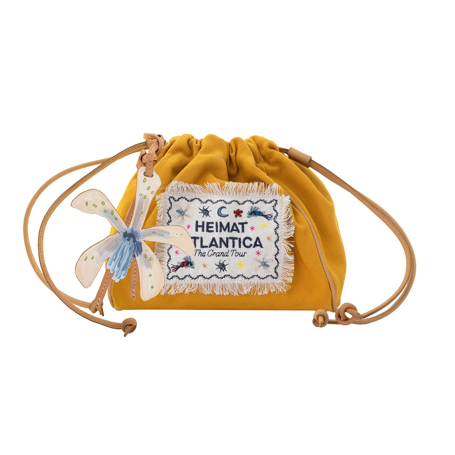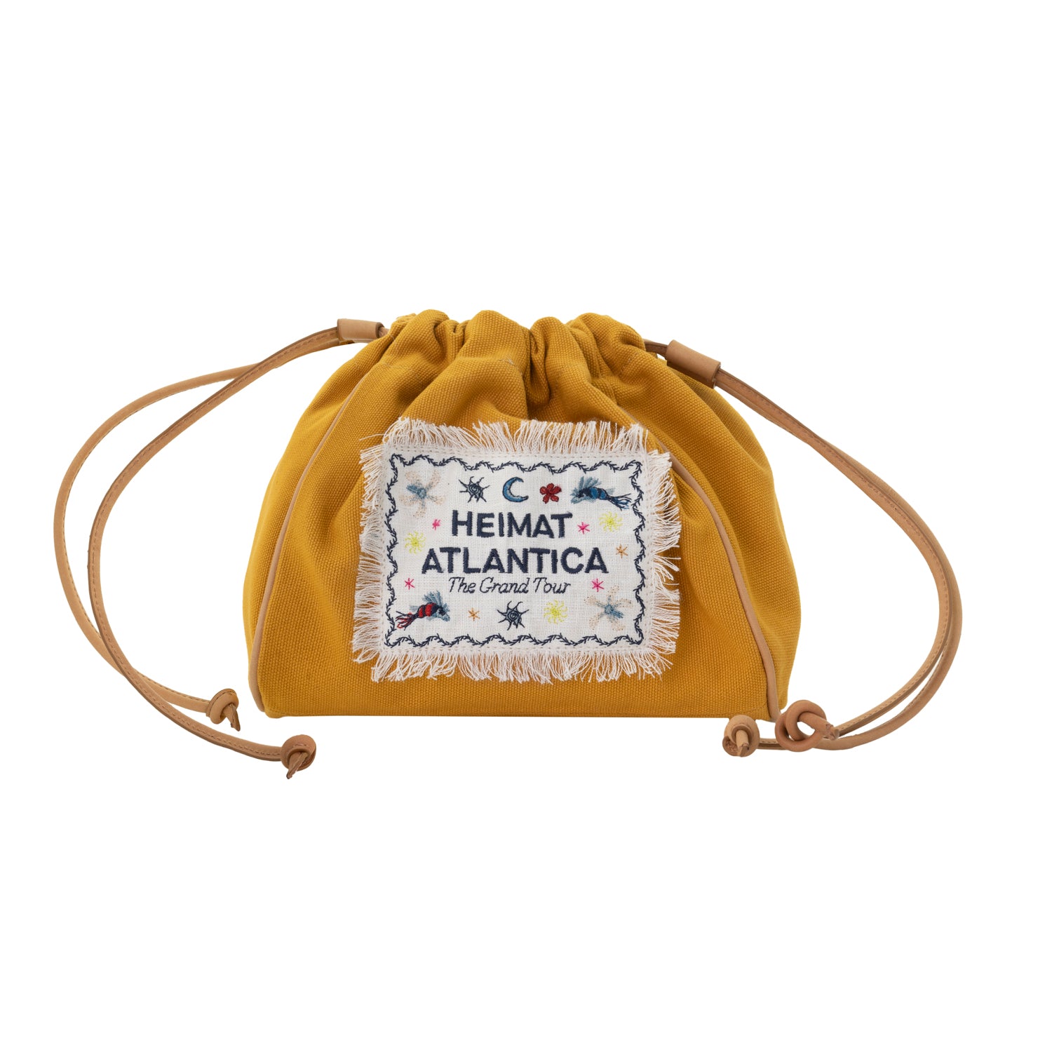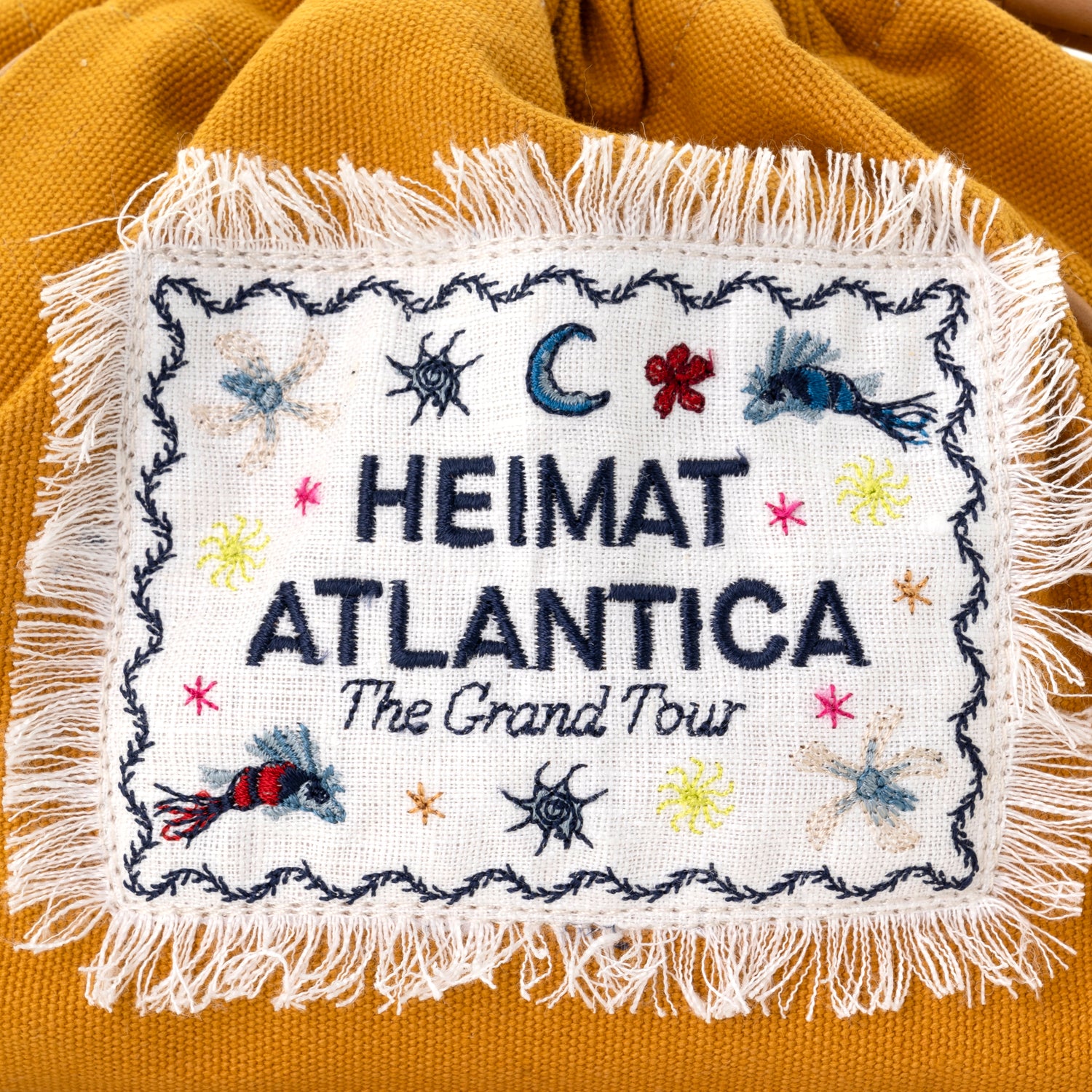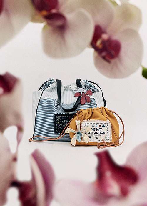 Handcrafted in Spain from cotton and leather, Heimat Atlantica’s pouches are finished with a striped exterior and an embroidered linen label—a small canvas of Galician magical realism, where the mythical fish glides between the Atlantic and the stars, carrying tales of distant lands where flowers bloom in unknown archipelagos.