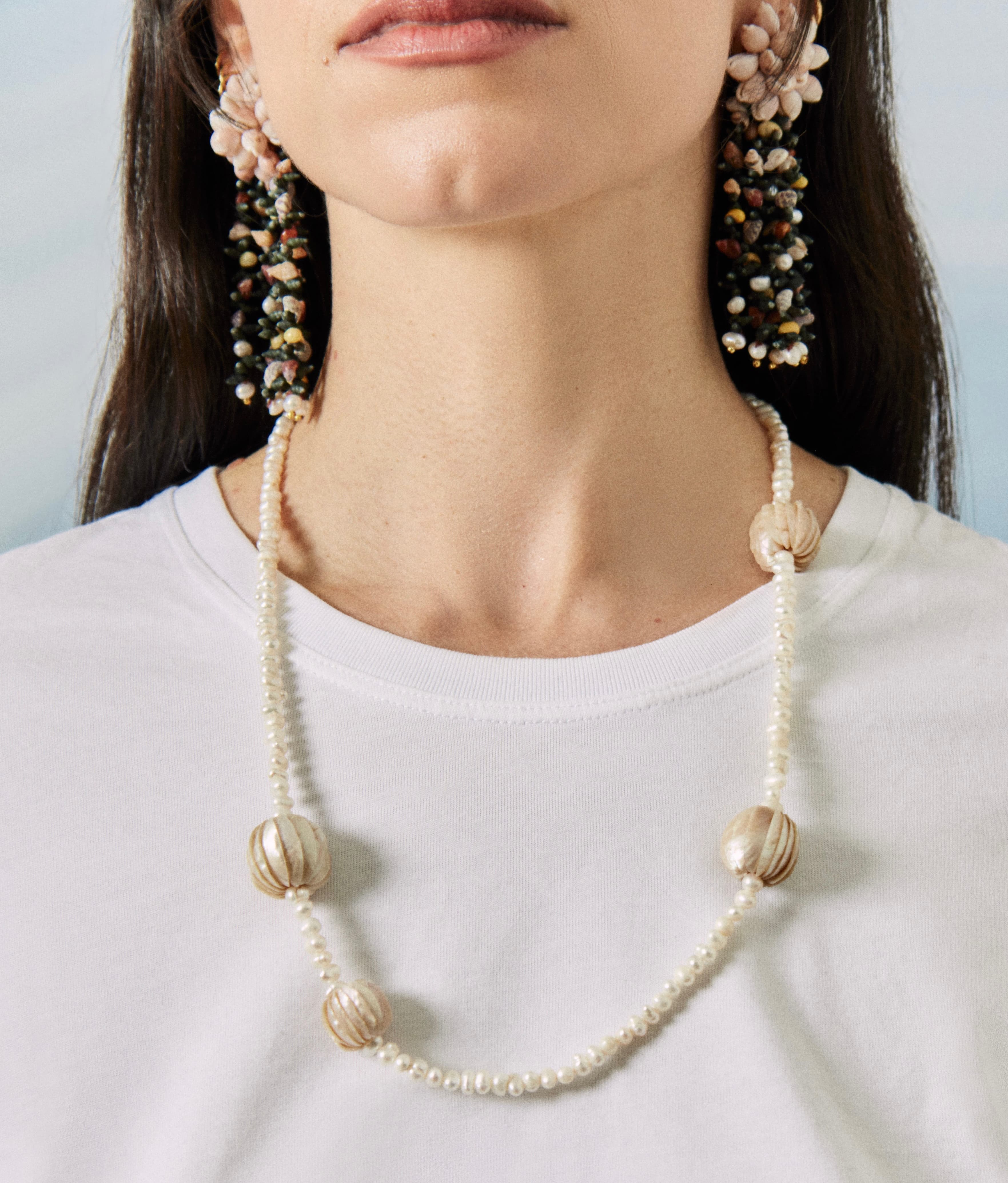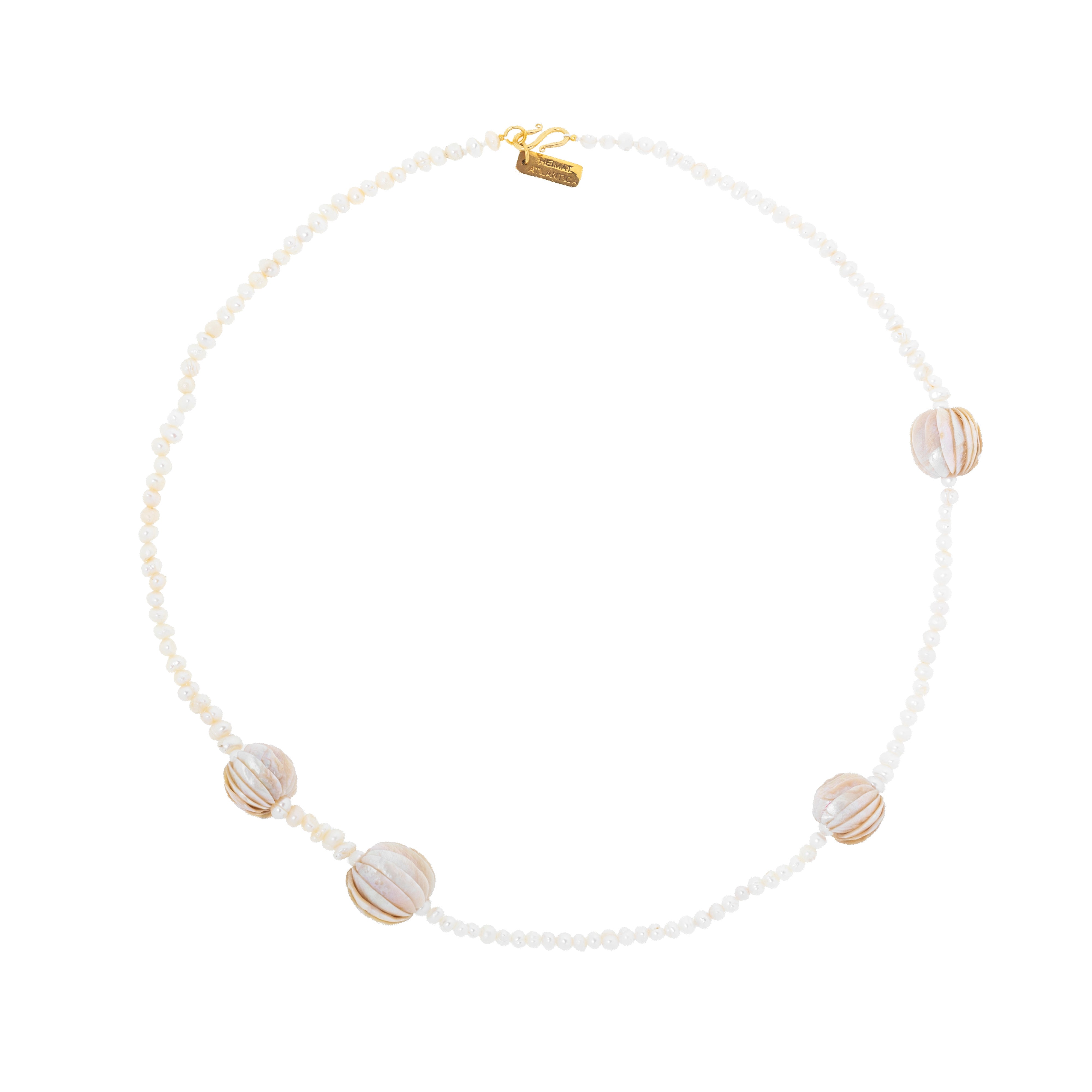 The SUSANE necklace features delicately handcrafted nacre beads and baroque pearls (3.5-4 mm), each reflecting the beauty of the ocean. It is finished with 925 Sterling Silver, gold-plated details, including the S-Hook Clasp, custom tag and ring.