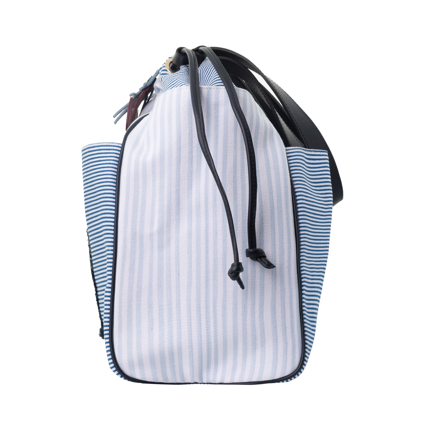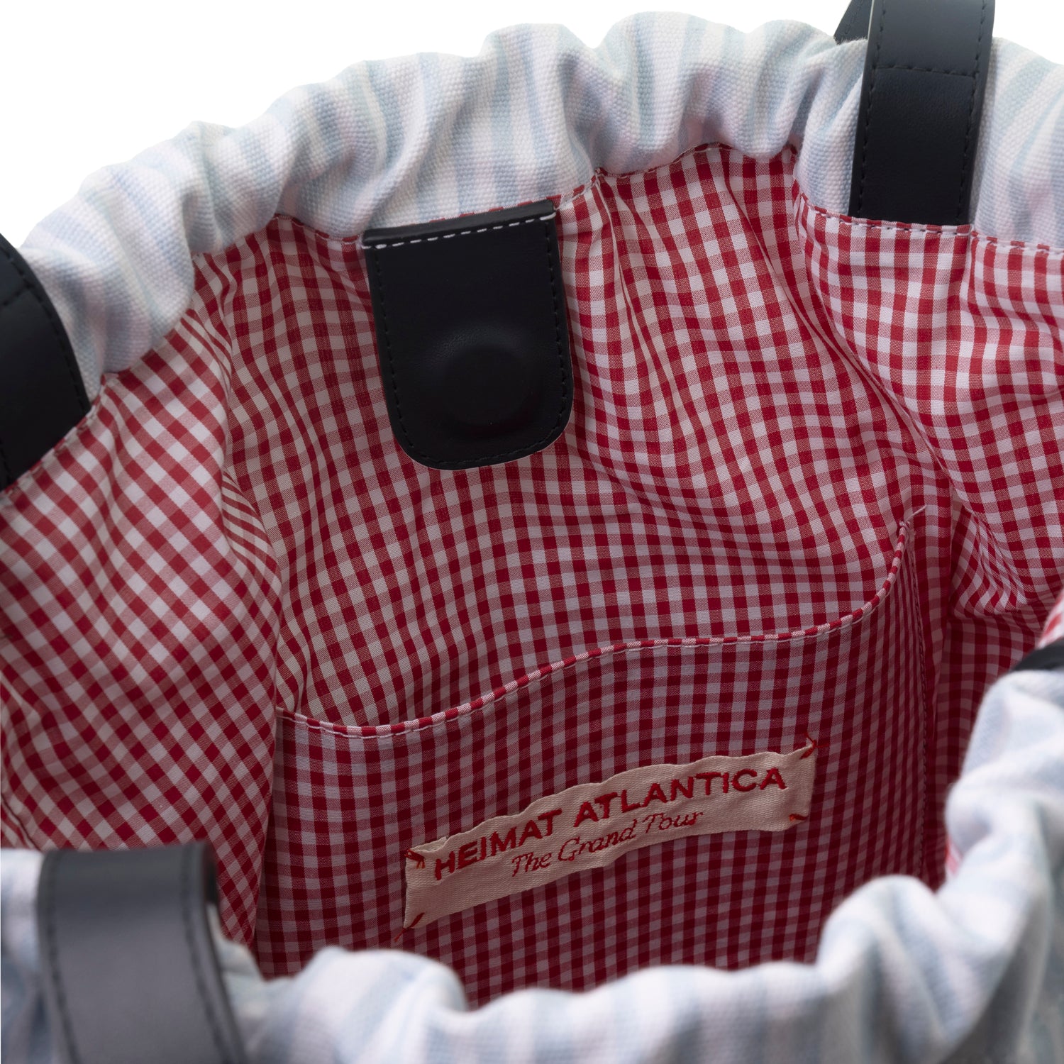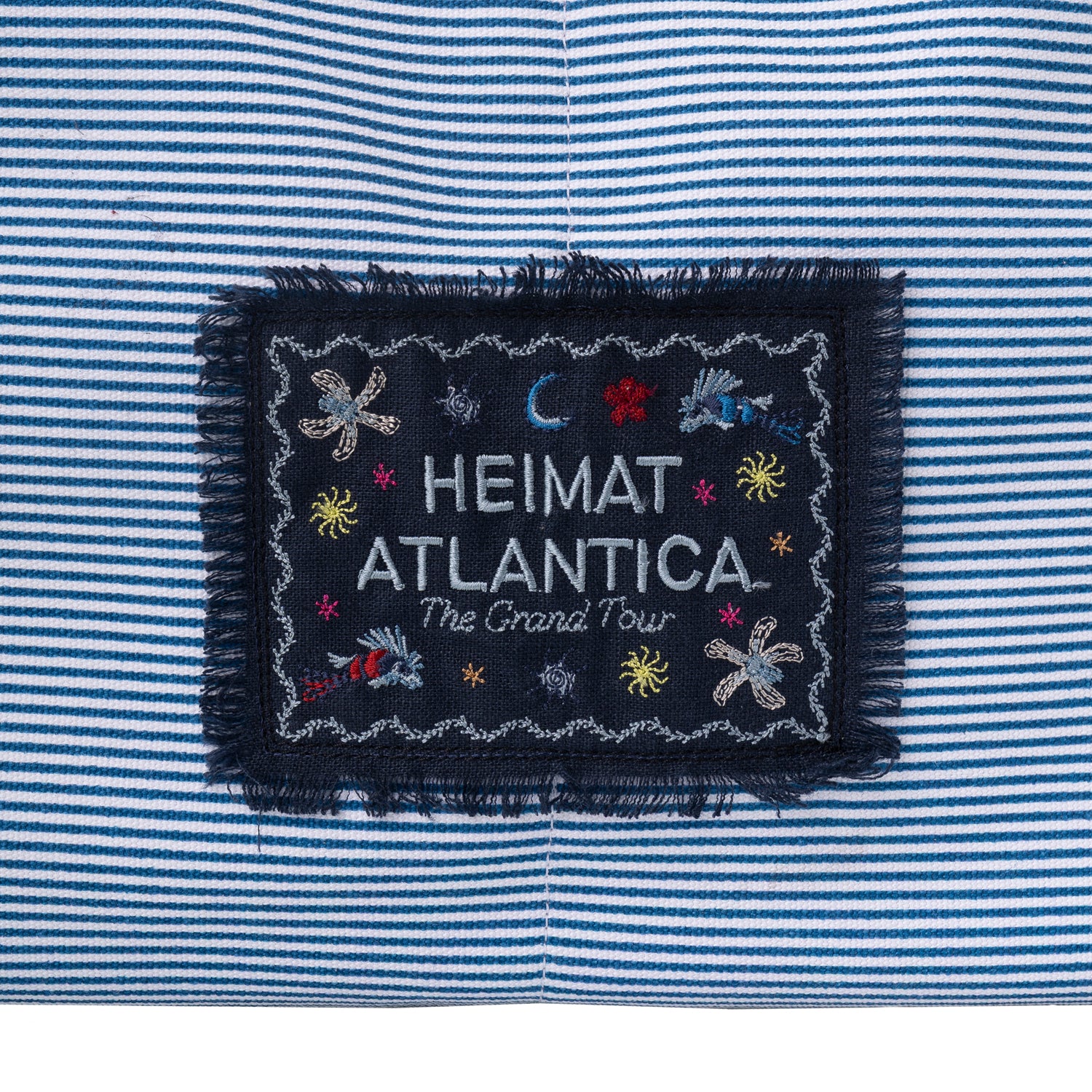 A tribute to seaside escapes and slow travel, the PATCHWORK BLUE TOTE combines different Heimat Atlantica patterns in a mosaic of soft blues. Crafted in the same cotton and leather blend as our pouches, its elongated shape and ruched closure make it ideal for carrying all that summer holds.